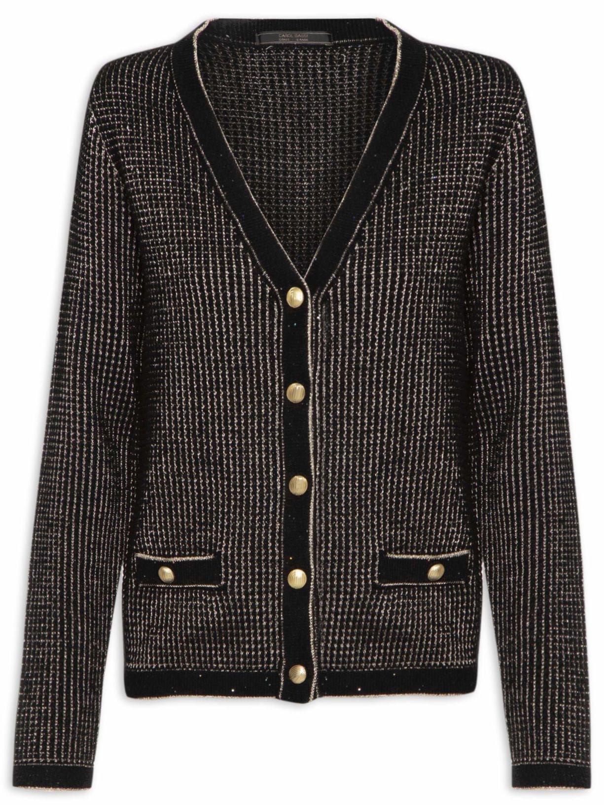 O casaco preto é confeccionado em tricot com fios de lurex e média elasticidade. A peça possui mangas longas, bolsos frontais decorativos com botões aplicados e fechamento frontal por botões metalizados.