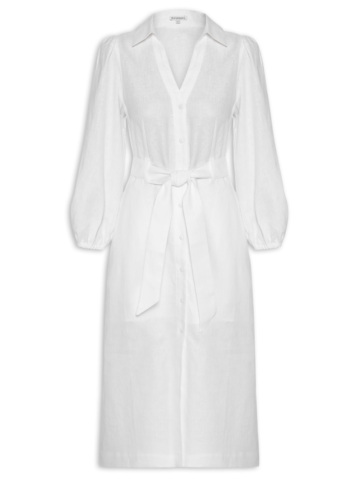 A chemise branca é confeccionada em linho sem elasticidade. A peça solta ao corpo possui colarinho clássico com recorte em V, longas com elástico embutido nos punhos, passantes aplicados na cintura, leve transparência, comprimento midi e fechamento frontal por botões.