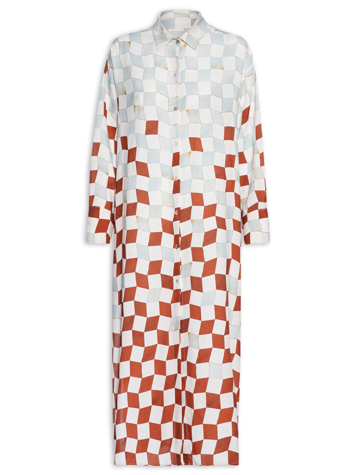 A chemise off white é confeccionada em tecido leve com toque de linho sem elasticidade. A peça solta ao corpo, possui colarinho clássico, ombros estendidos, mangas longas com abotoamento nos punhos, fendas laterais, estampa geométrica em cores contrastantes, comprimento midi e fechamento frontal por botões.