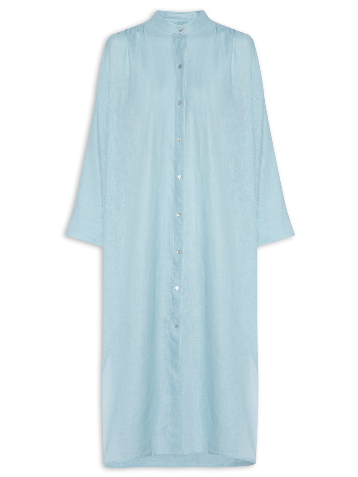 O chemise azul é confeccionado em linho misto sem elasticidade. A peça solta ao corpo possui gola padre, mangas 7/8 com abotoamento nos punhos, detalhe de franzido nos ombros, fendas laterais, recorte posterior com detalhes de franzidos, comprimento midi e fechamento frontal por botões.