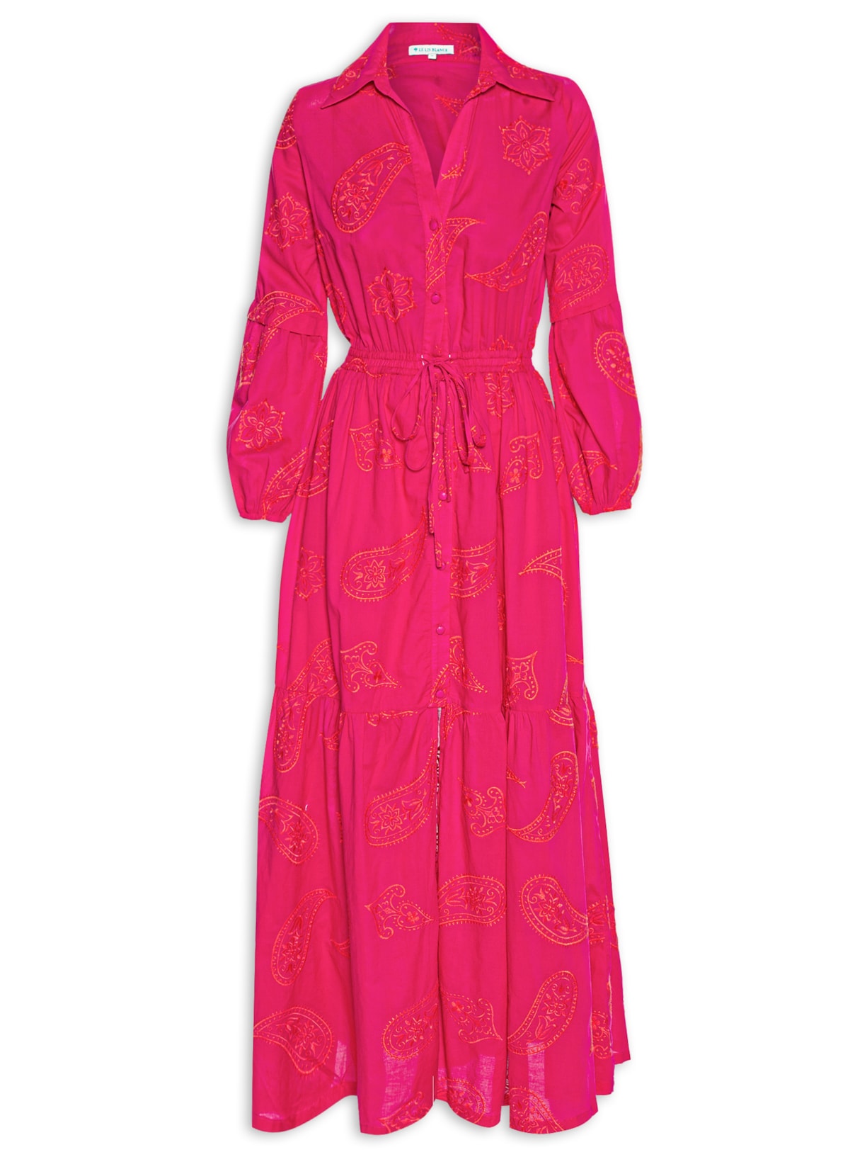 A chemise rosa é confeccionada em tecido leve sem elasticidade. A peça solta ao corpo possui colarinho clássico, mangas longas com costura sobreposta e elástico embutido nos punhos, elástico e cordões embutidos na cintura, padronagem em paisley em tom contrastante, comprimento longo, forro, fechamento frontal por botões.