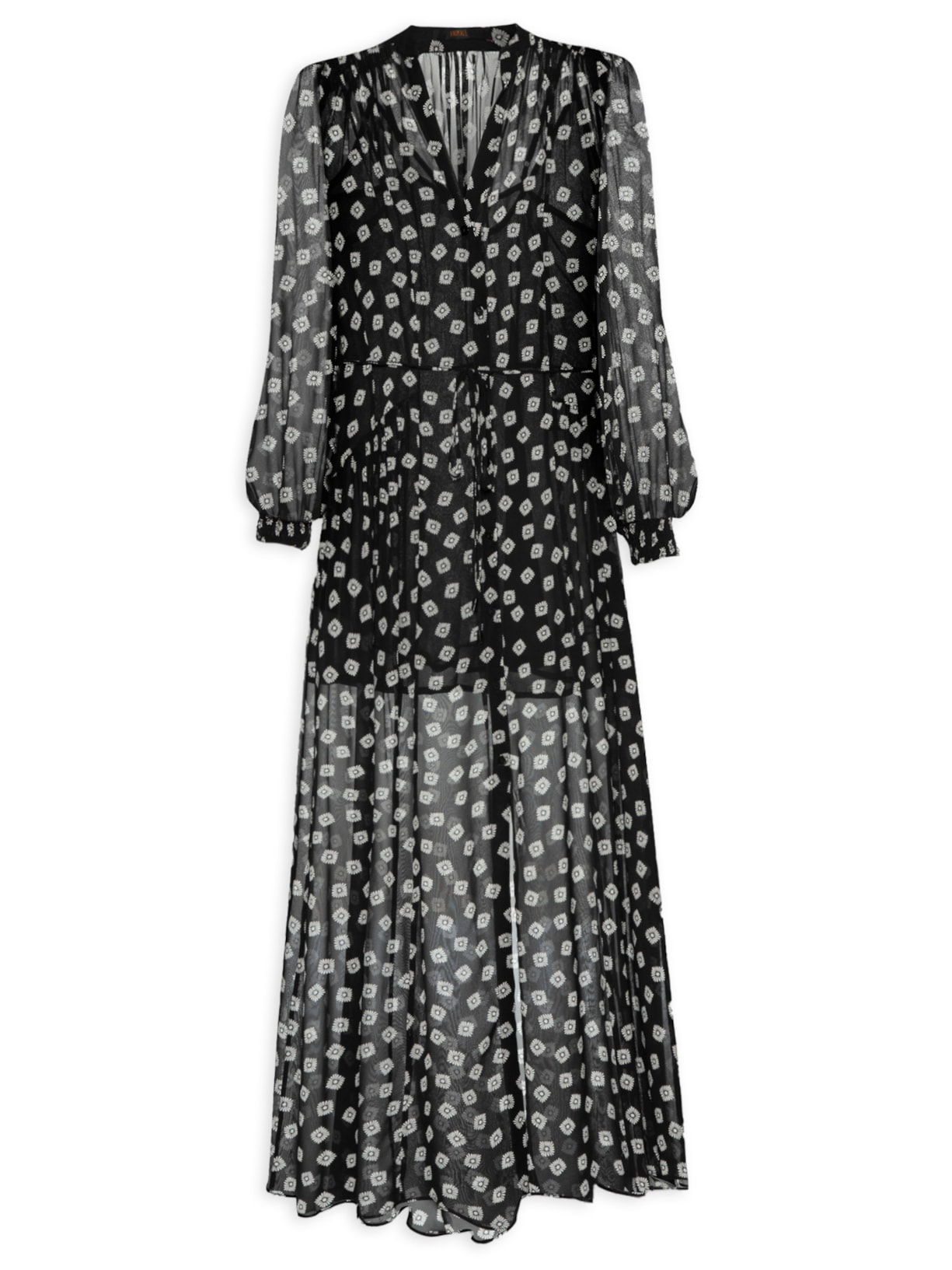 Investir em peças de materiais leves e shapes mais fluidos é a garantia de sucesso para a estação. Aposte no vestido da Animale com a sandália de salto, bolsa e brincos metalizados.