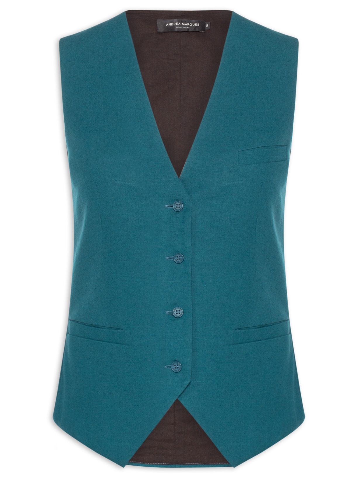 O colete azul é confeccionado em linho misto sem elasticidade. A peça solta ao corpo possui decote V, alças largas, cavas estendidas, bolsos frontais, pences frontais, recortes frontais e posteriores, tira média aplicada na parte posterior com fivela metálica para ajuste, barra frontal assimétrica, forro e fechamento frontal em botões.