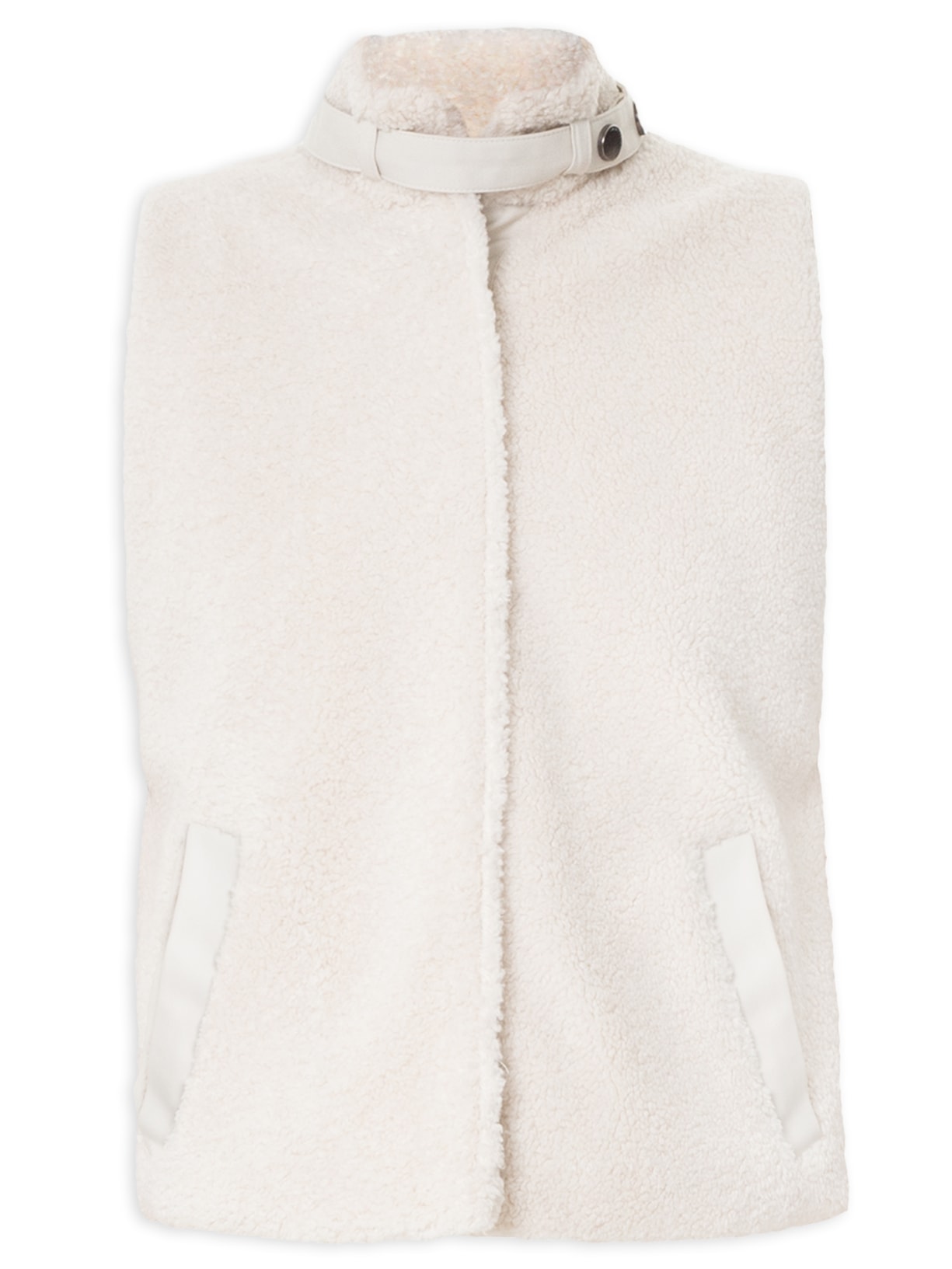O colete bege é confeccionada em pelúcia sem elasticidade. A peça solta ao corpo possui gola alta com tira de fecho por botões de pressão aplicada, cavas levemente estendidas, bolsos frontais embutidos, forro e fechamento frontal por botões de pressão.