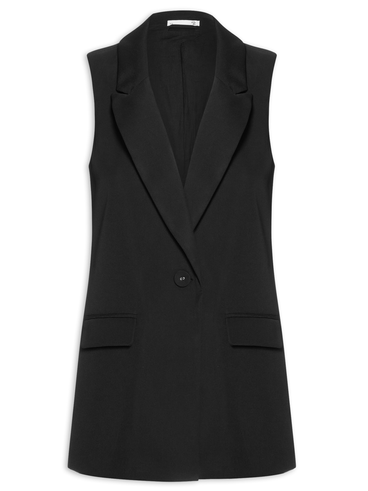 O colete preto é confeccionado por tecido leve sem elasticidade. A peça solta ao corpo possui lapela chanfrada, cavas estendidas, bolsos frontais decorativos com aba sobreposta, recorte posterior com fenda aplicada, forro e fechamento por botão frontal.