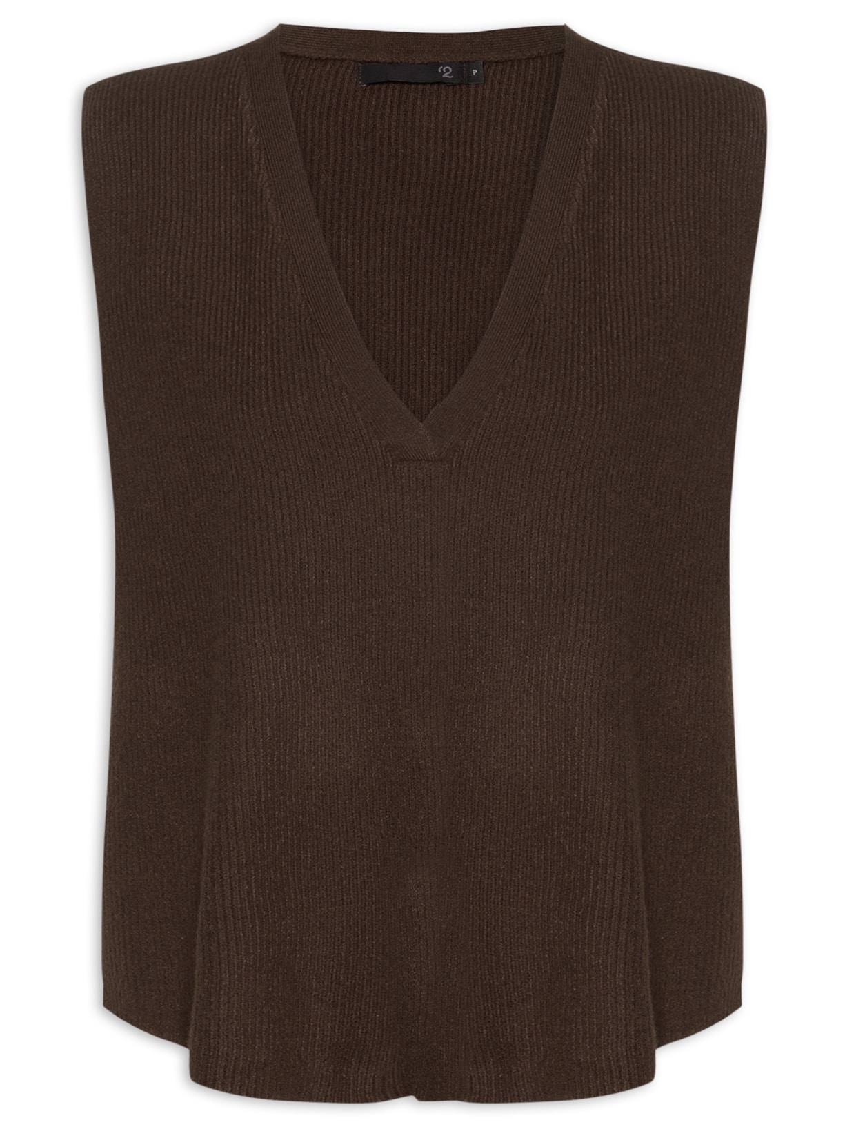 O colete marrom é confeccionado em tricot com superfície texturizada e alta elasticidade. A peça solta ao corpo possui decote V profundo, alças largas, cavas estendidas e barra arredondada.