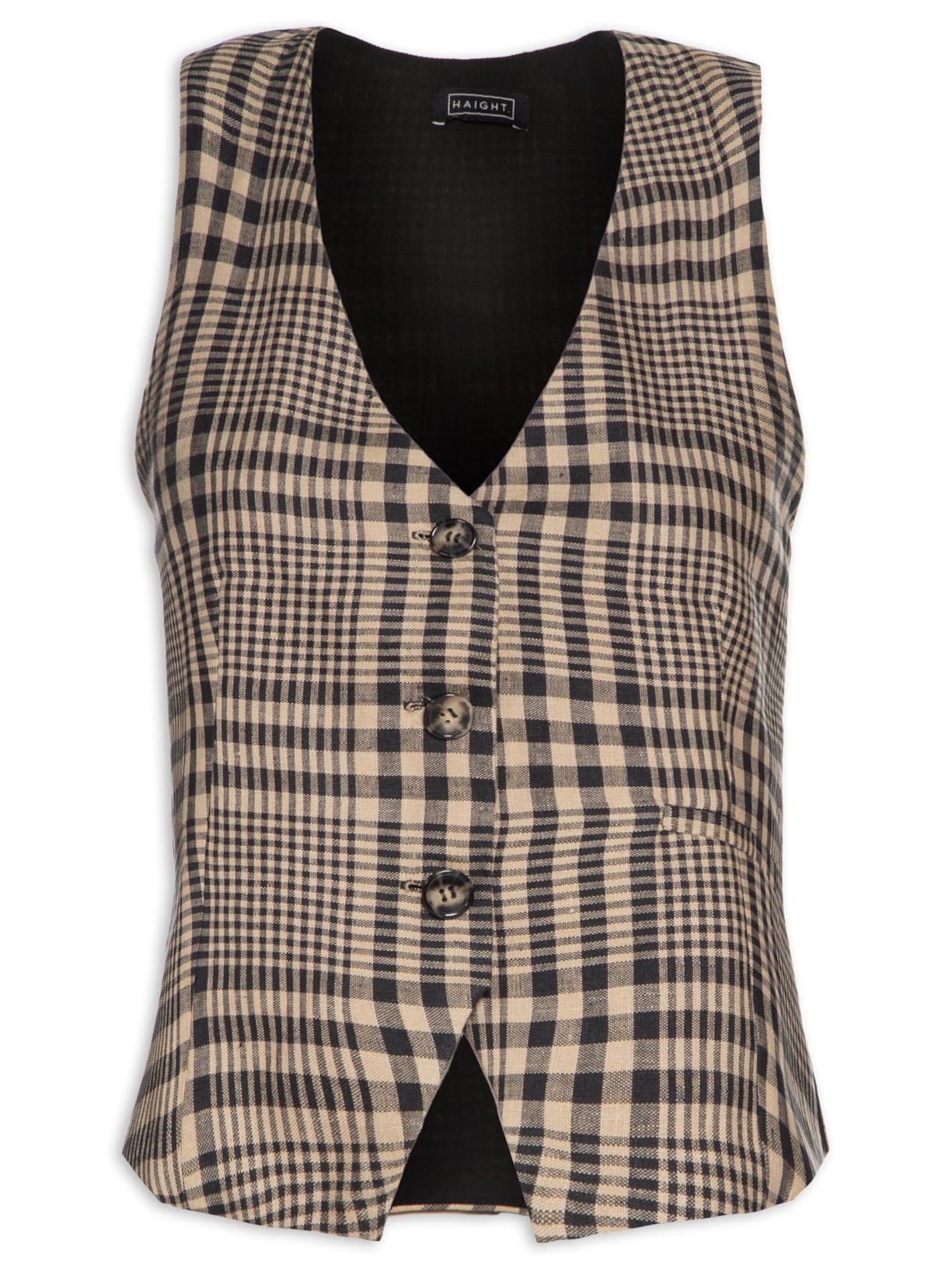 O xadrez é essencial no closet da estação: aposte na padronagem com estilo mais sofisticado e moderno! Aposte nesse colete da Haight com uma calça de alfaiataria, sandália preta e brincos delicados