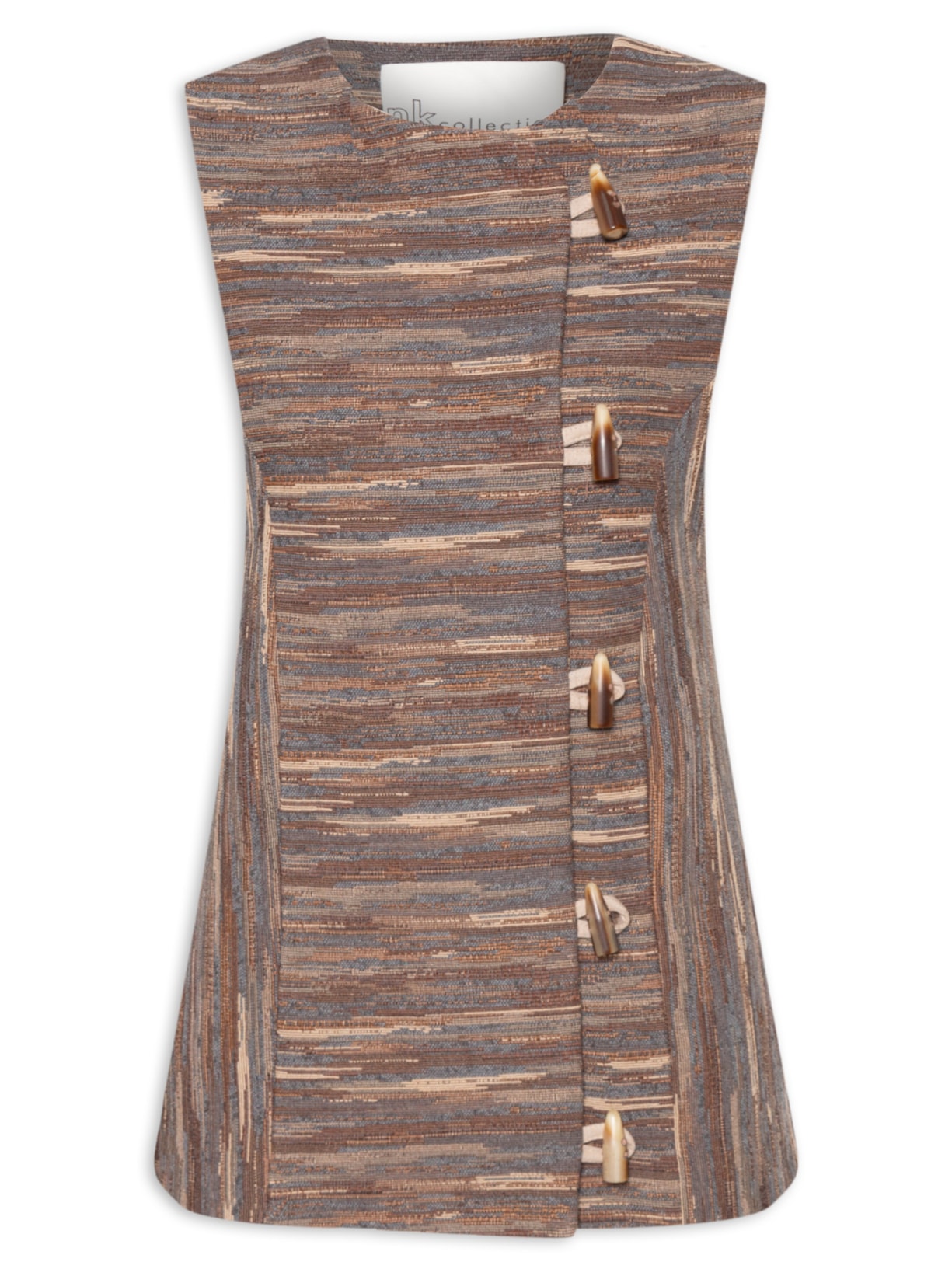 O colete marrom é confeccionado em jacquard sem elasticidade. A peça solta ao corpo possui decote redondo, alças largas, cavas estendidas, recorte posterior, recortes frontais, bolsos frontais embutidos, padronagem listrada em cores contrastantes, forro e fechamento frontal por botões com detalhe de transpasse.
