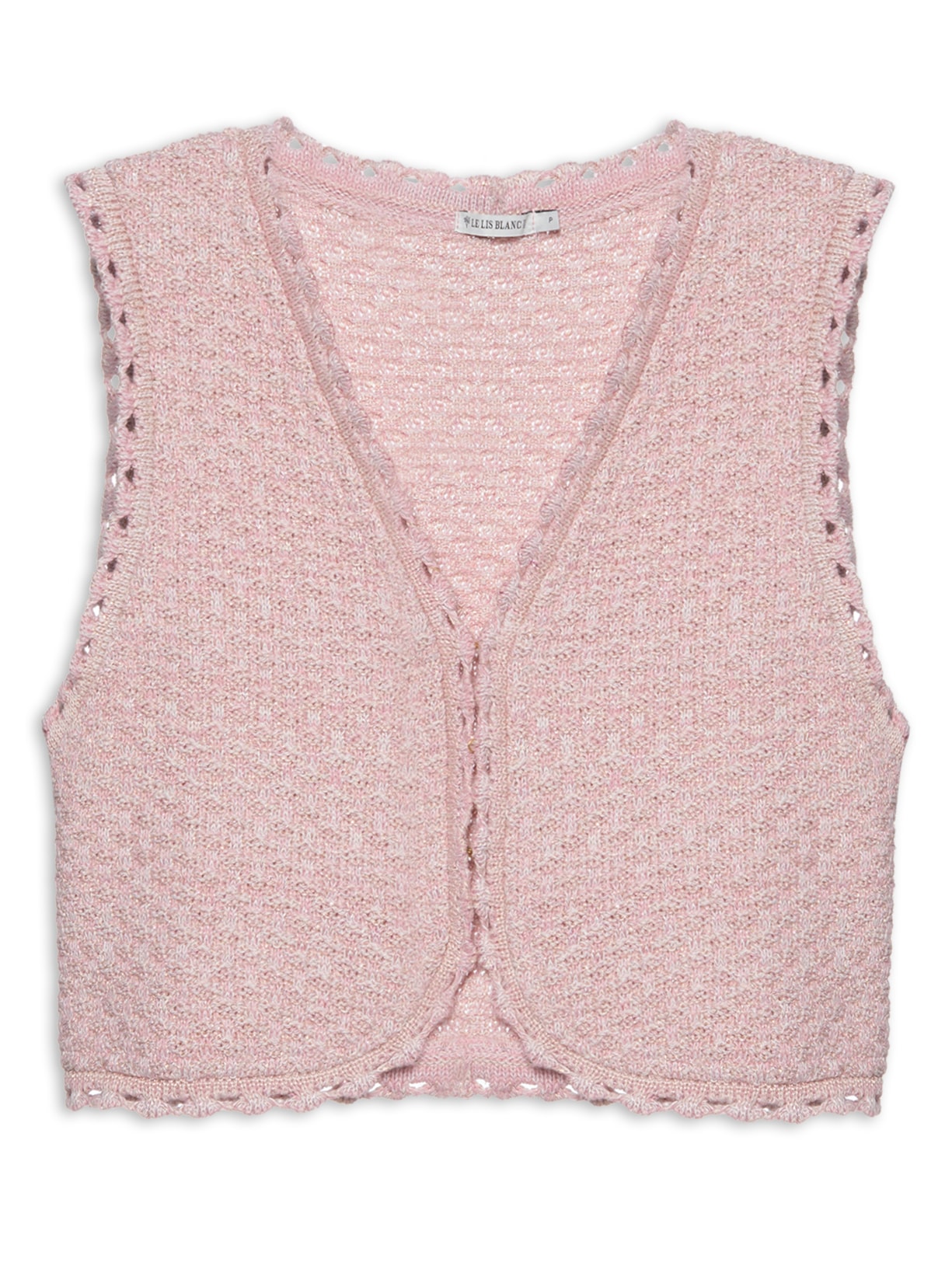 O colete rosa é confeccionado em tricot com superfície texturizada e baixa elasticidade. A peça solta ao corpo possui decote V, alças médias, cavas estendidas, comprimento cropped* e fechamento frontal por colchetes.