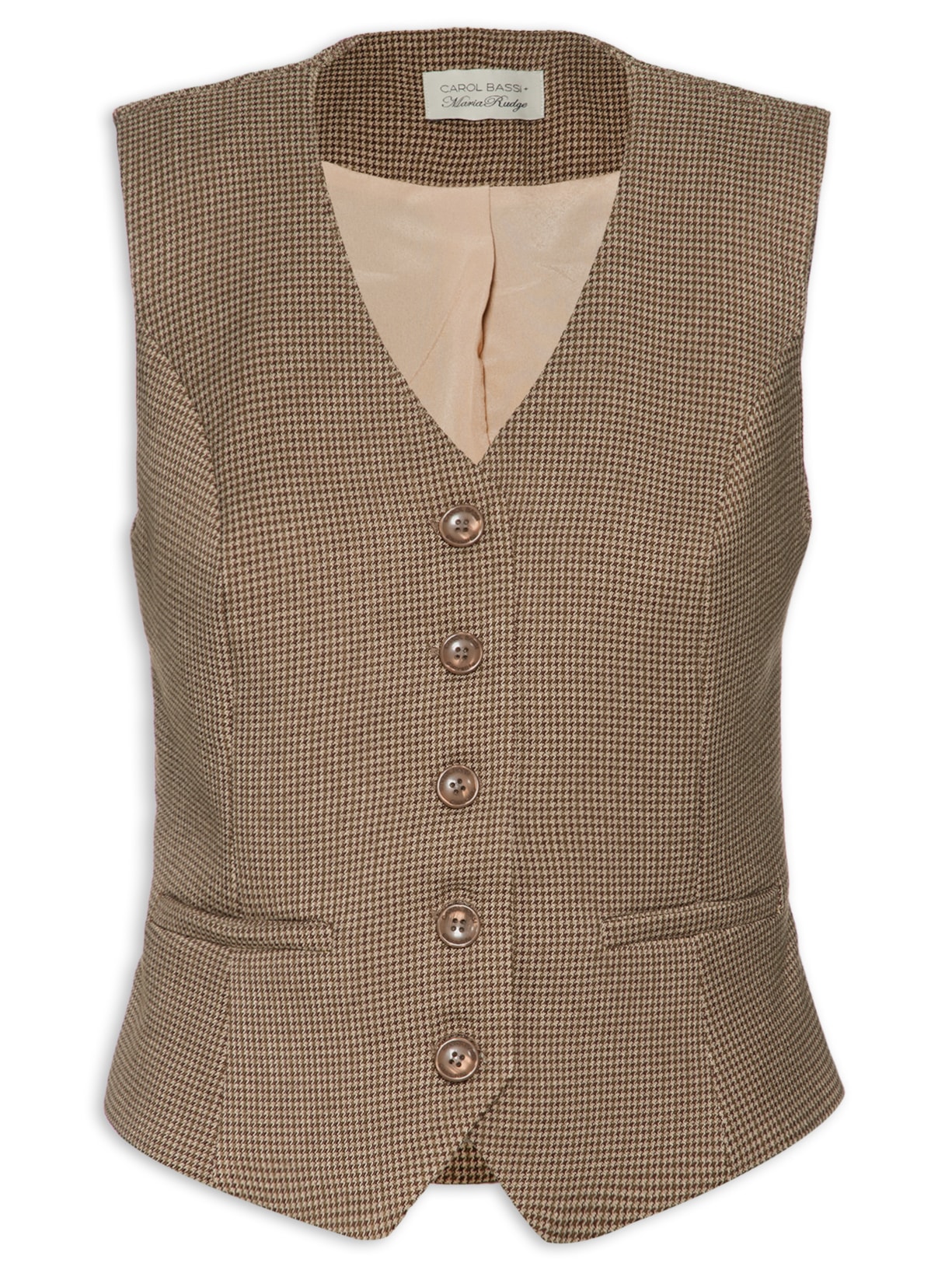 O colete marrom é confeccionado em tecido encorpado sem elasticidade. A peça solta ao corpo possui decote V, alças largas, cavas regulares, recortes posteriores e frontais, forro, bolsos frontais decorativos, estampa pied de poule em tom contrastante e fechamento frontal por botões.