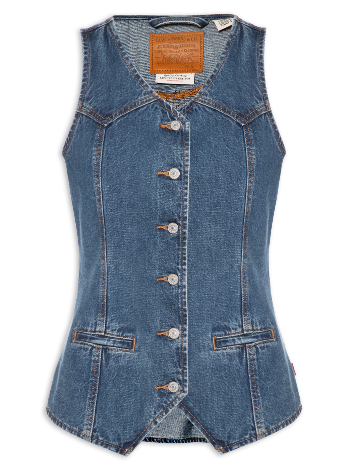 Os coletes também são capazes de compor looks elegantes e poderosos. Aposte neste da Levi's com a saia longa, cinto metalizado, sandália flat e brincos modernos para trazer um ar ainda mais fashion ao seu visual.