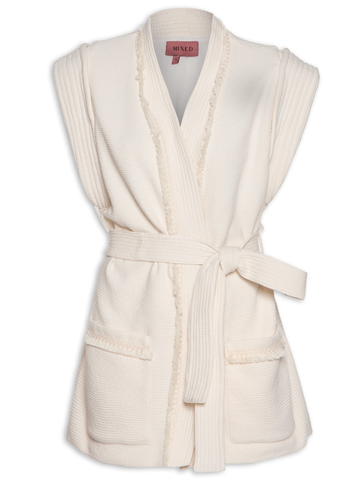O colete off white é confeccionado por tricot com média elasticidade. A peça solta ao corpo possui ombros estendidos, cavas estendidas, recortes nas cavas e gola, bolsos frontais, passantes posteriores, forro, fechamento frontal por amarração e comprimento alongado. Acompanha cinto em tira média alongada para amarração e uso opcional.