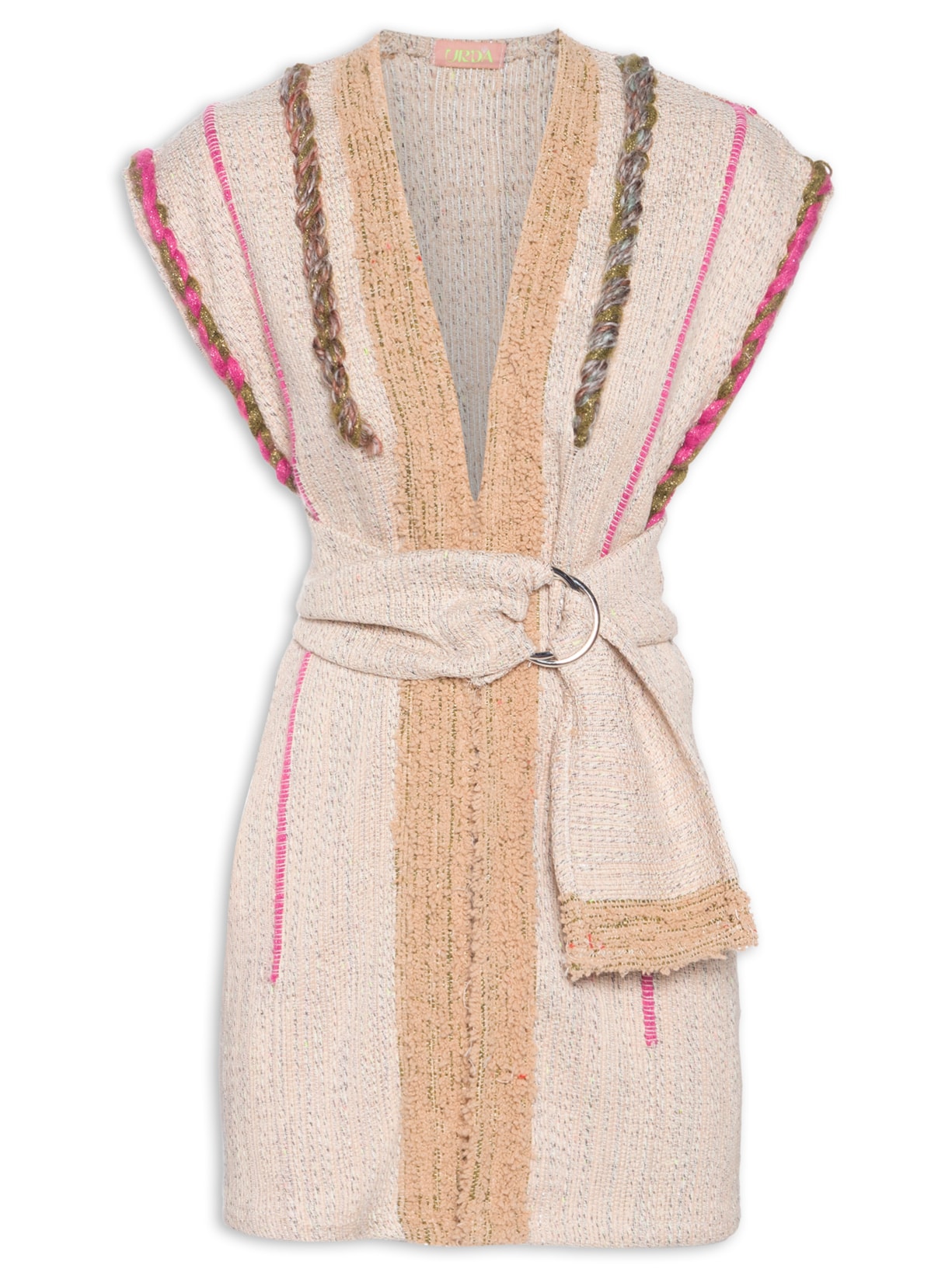 O colete da Urda transmite um visual super alegre, fashion, cheio de texturas e que resgata tendências do passado, mas com toques de modernidade. Combine o seu com o short curto, bota de cano alto e brincos combinando para finalizar.