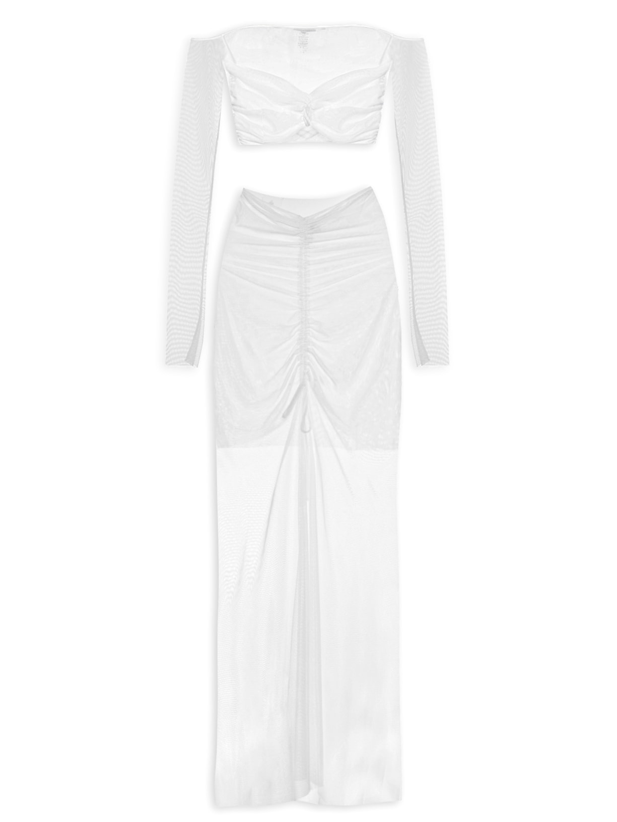 O conjunto branco é confeccionado em tule. A blusa possui decote ombro à ombro com tag metalizada da marca aplicada na parte posterior, mangas longas, recortes frontais sobrepostos com detalhes de enlace frontal e franzidos laterais, forro, transparência, comprimento cropped* e shape justo. A saia possui cintura alta, cós anatômico com tag metalizada da marca aplicada na parte posterior, recorte frontal com fenda e detalhe de franzido ajustável por cordão embutido, meio forro, transparência, comprimento longo e shape justo.