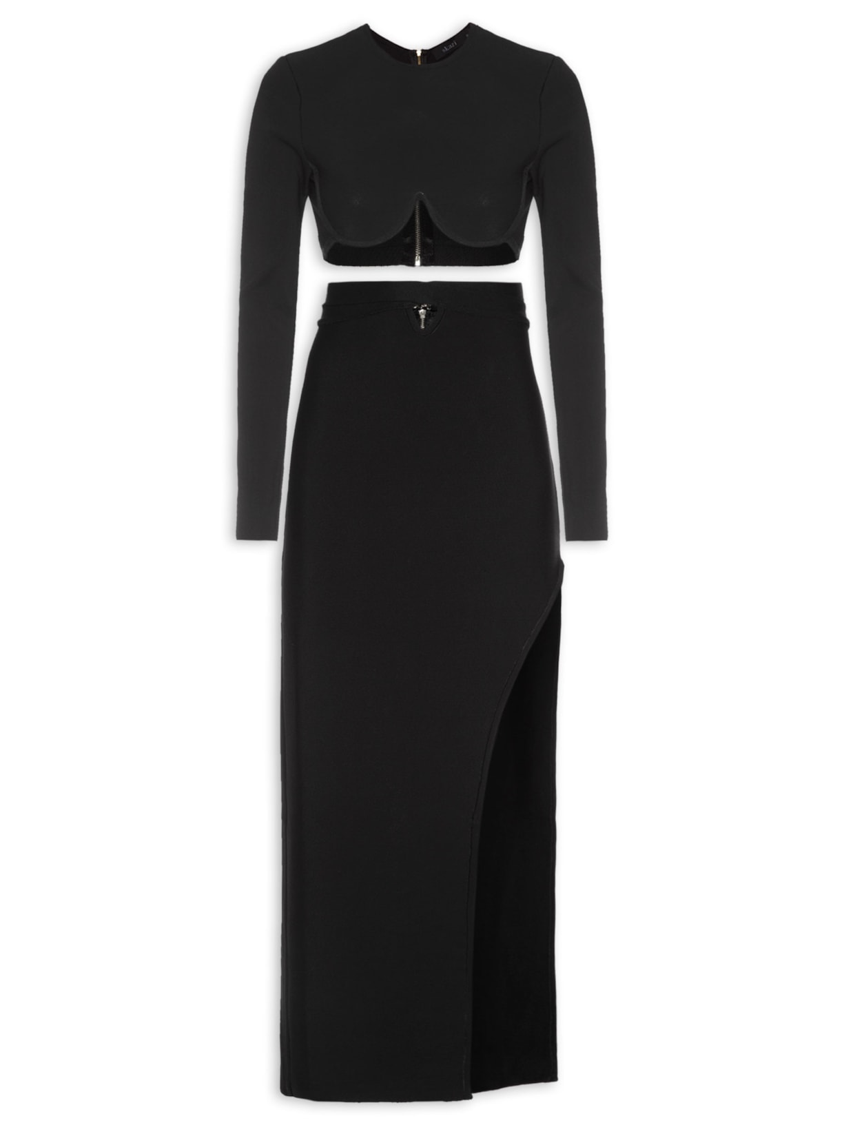 O conjunto preto é confeccionado em malha canelada. O top possui decote redondo, ombros estruturados com enchimento, mangas longas, aros aplicados no busto para sustentação, shape justo, comprimento cropped, acabamento pespontado e fechamento posterior por zíper metalizado. A saia possui cintura alta, faixas aplicadas na cintura com colchetes para prender, fenda lateral, comprimento longo, shape justo, caimento reto e acabamento pespontado.