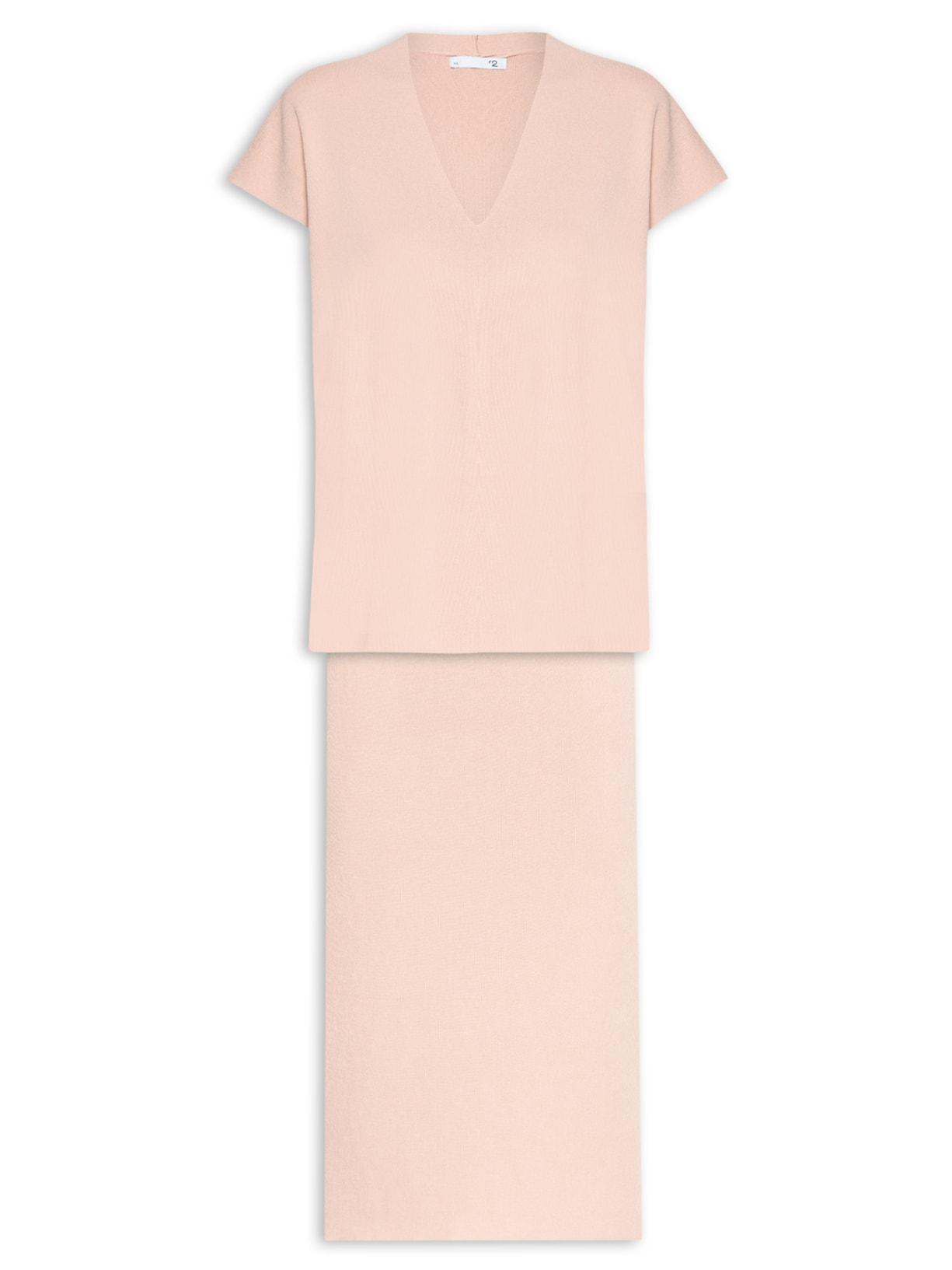 O conjunto bege é confeccionado em tricot com baixa elasticidade. A blusa solta ao corpo possui decote V, mangas curtas e recorte com fenda nas partes laterais. A saia solta ao corpo possui cintura alta, cós com elástico embutido e comprimento midi.