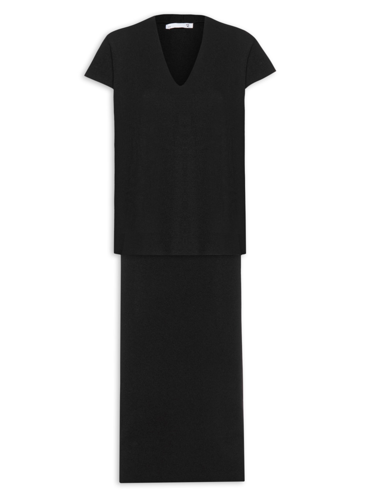 O conjunto preto é confeccionado em tricot com baixa elasticidade. A blusa solta ao corpo possui decote V, mangas curtas e recorte com fenda nas partes laterais. A saia solta ao corpo possui cintura alta, cós com elástico embutido e comprimento midi.