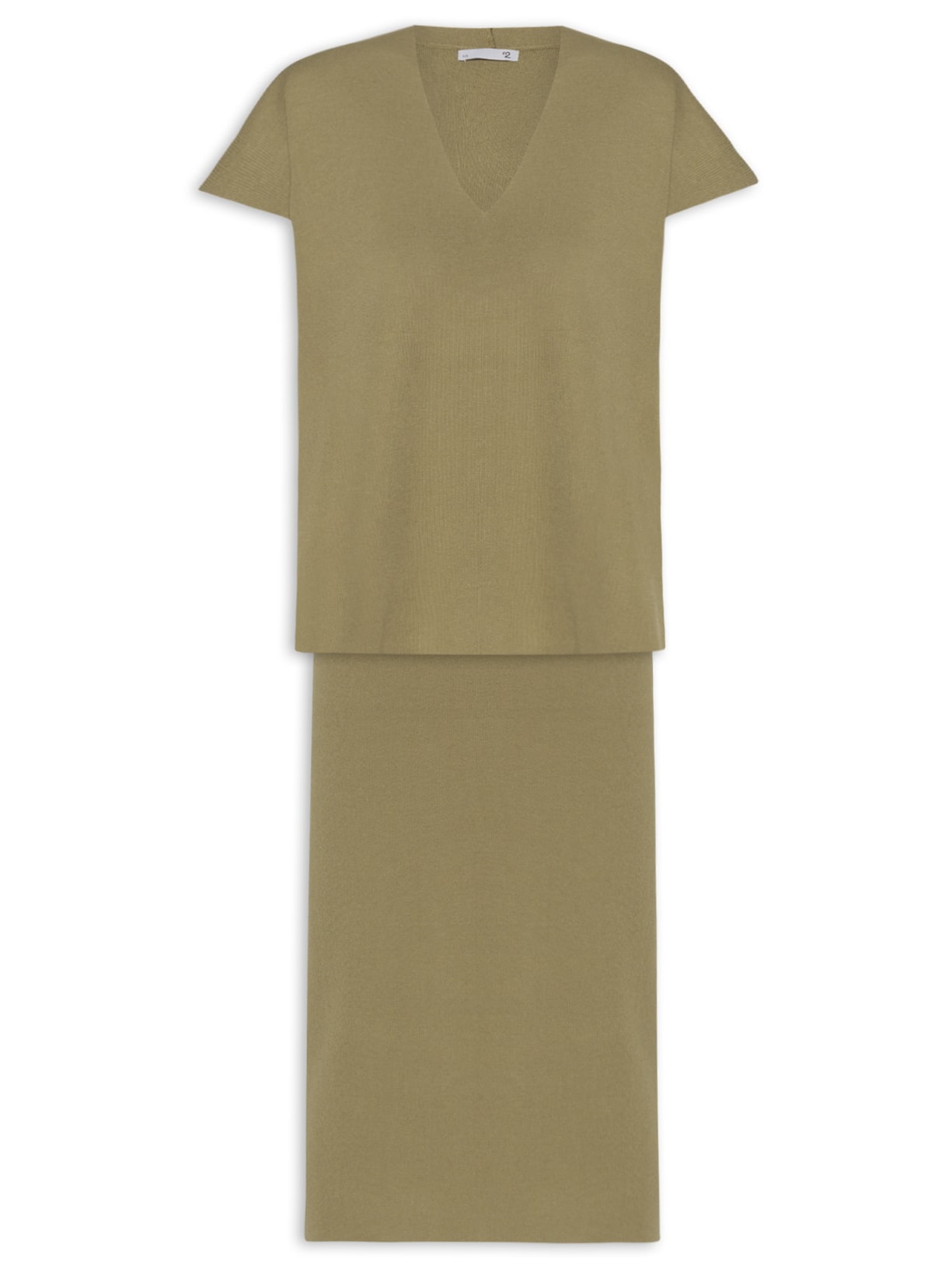 O conjunto verde é confeccionado em tricot com baixa elasticidade. A blusa solta ao corpo possui decote V, mangas curtas e recorte com fenda nas partes laterais. A saia solta ao corpo possui cintura alta, cós com elástico embutido e comprimento midi.