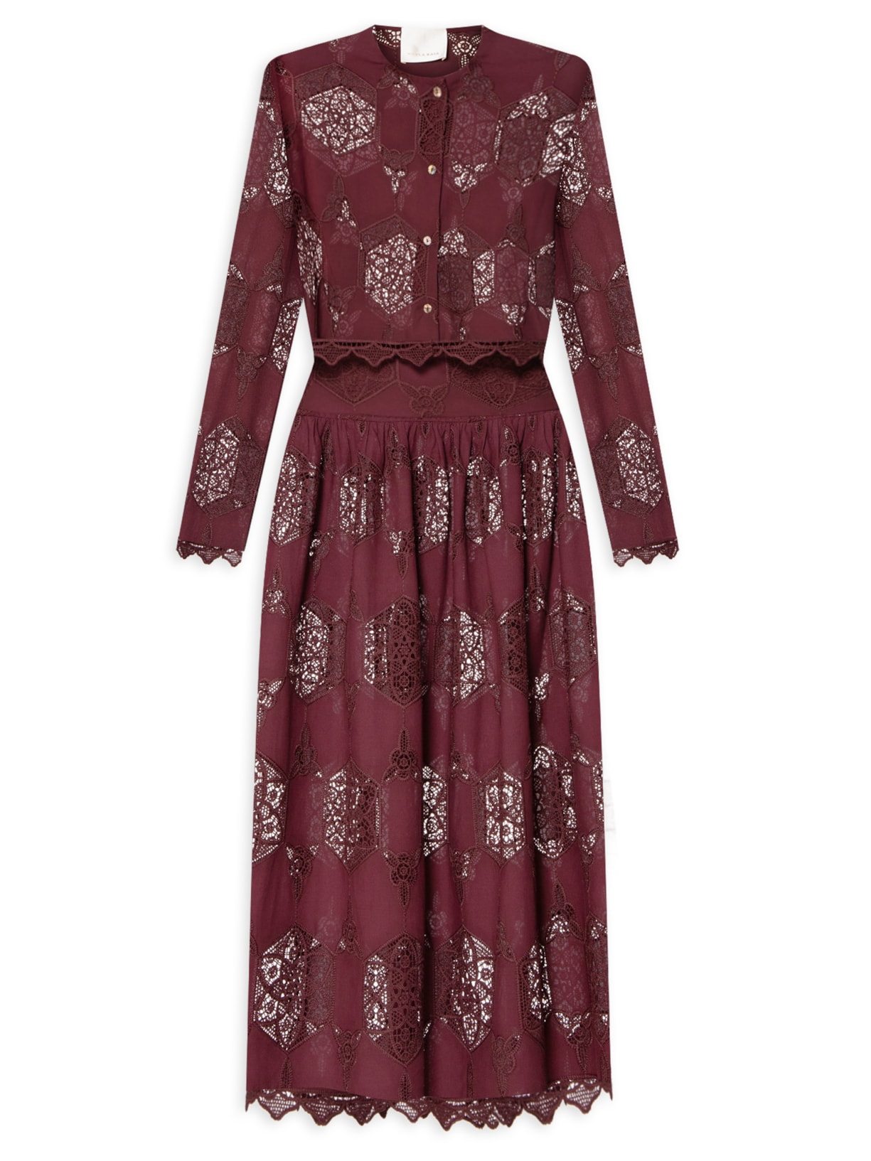 O conjunto vinho é confeccionado em tecido leve sem elasticidade. A camisa solta ao corpo possui decote redondo, mangas longas, recortes em renda com transparência, comprimento cropped* e fechamento frontal por botões. A saia solta ao corpo possui cintura alta, cós amplo, recortes em renda com transparência, comprimento midi e fechamento posterior por zíper.