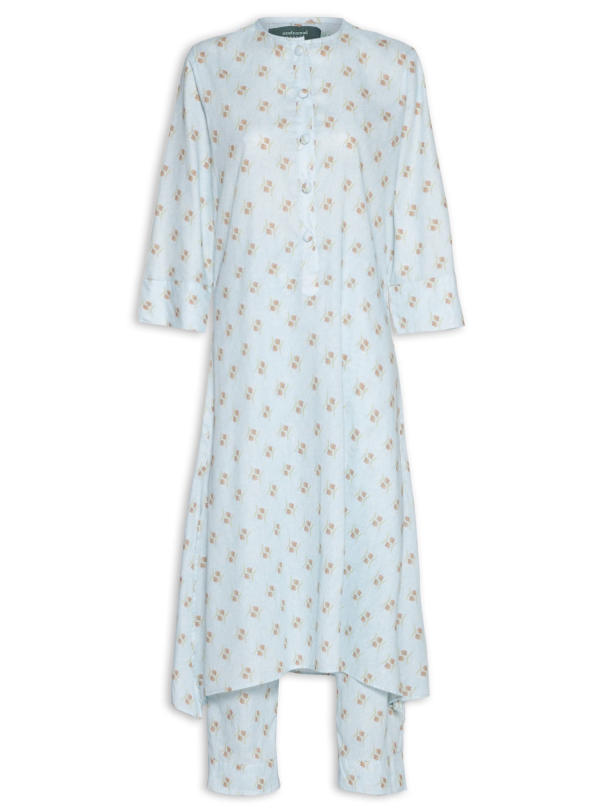 O conjunto azul contém uma calça e um kaftan confeccionados em tecido leve sem elasticidade. O kaftan solto ao corpo possui decote redondo com fechamento frontal por botões forrados, mangas 7/8, recorte posterior com detalhes de pregas, fendas laterais, estampa figurativa de alcachofras em cores contrastantes e comprimento midi. A calça solta ao corpo possui cintura alta, cós com elástico embutido na parte posterior, pregas frontais, estampa figurativa de alcachofras em cores contrastantes e comprimento longo.