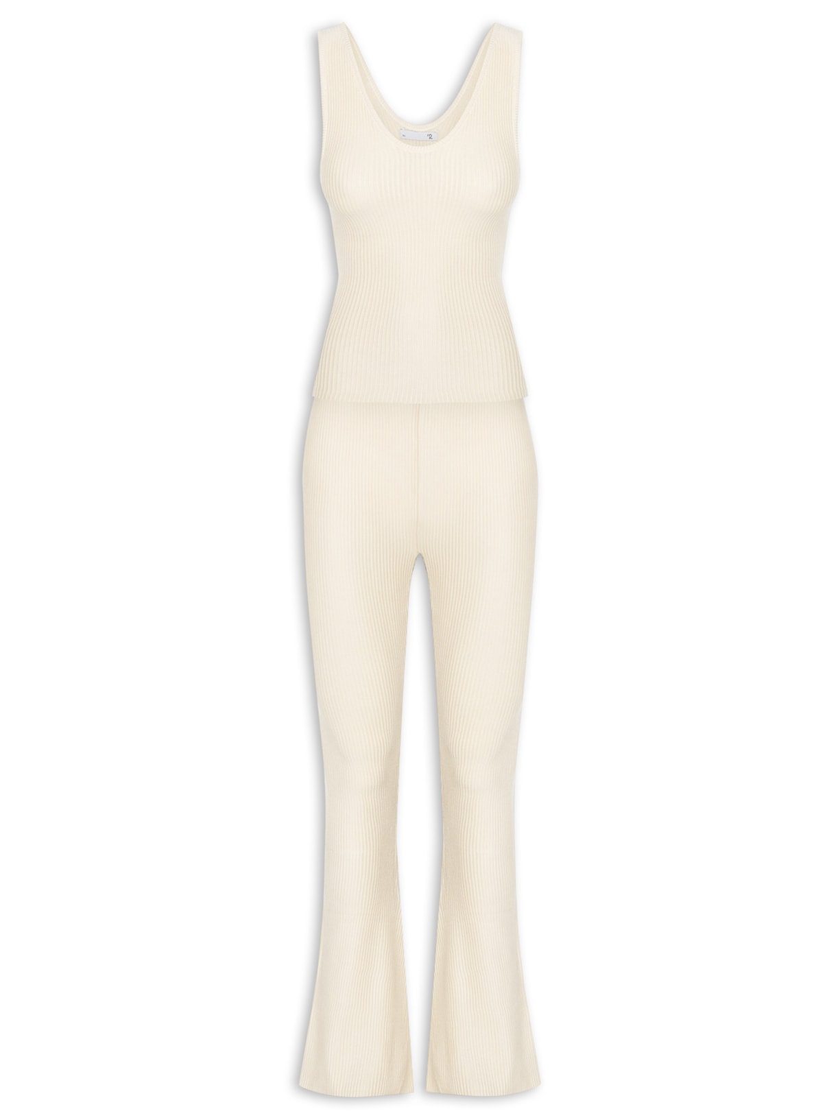 O conjunto bege é confeccionado em tricot com alta elasticidade. A regata justa ao corpo possui decote V, alças médias e cavas regulares. A calça solta ao corpo possui cintura alta, cós com elástico embutido e comprimento longo.