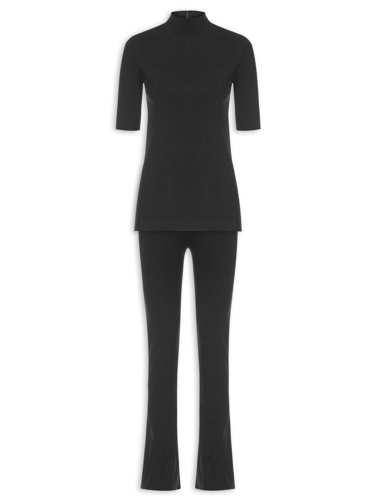 O conjunto preto é confeccionado em malha canelada com alta elasticidade. A blusa justa ao corpo possui gola alta com abertura frontal e fechamento por zíper, mangas 3/4 e fendas laterais. A calça justa ao corpo possui cintura alta, cós com elástico embutido e fendas na barra.
