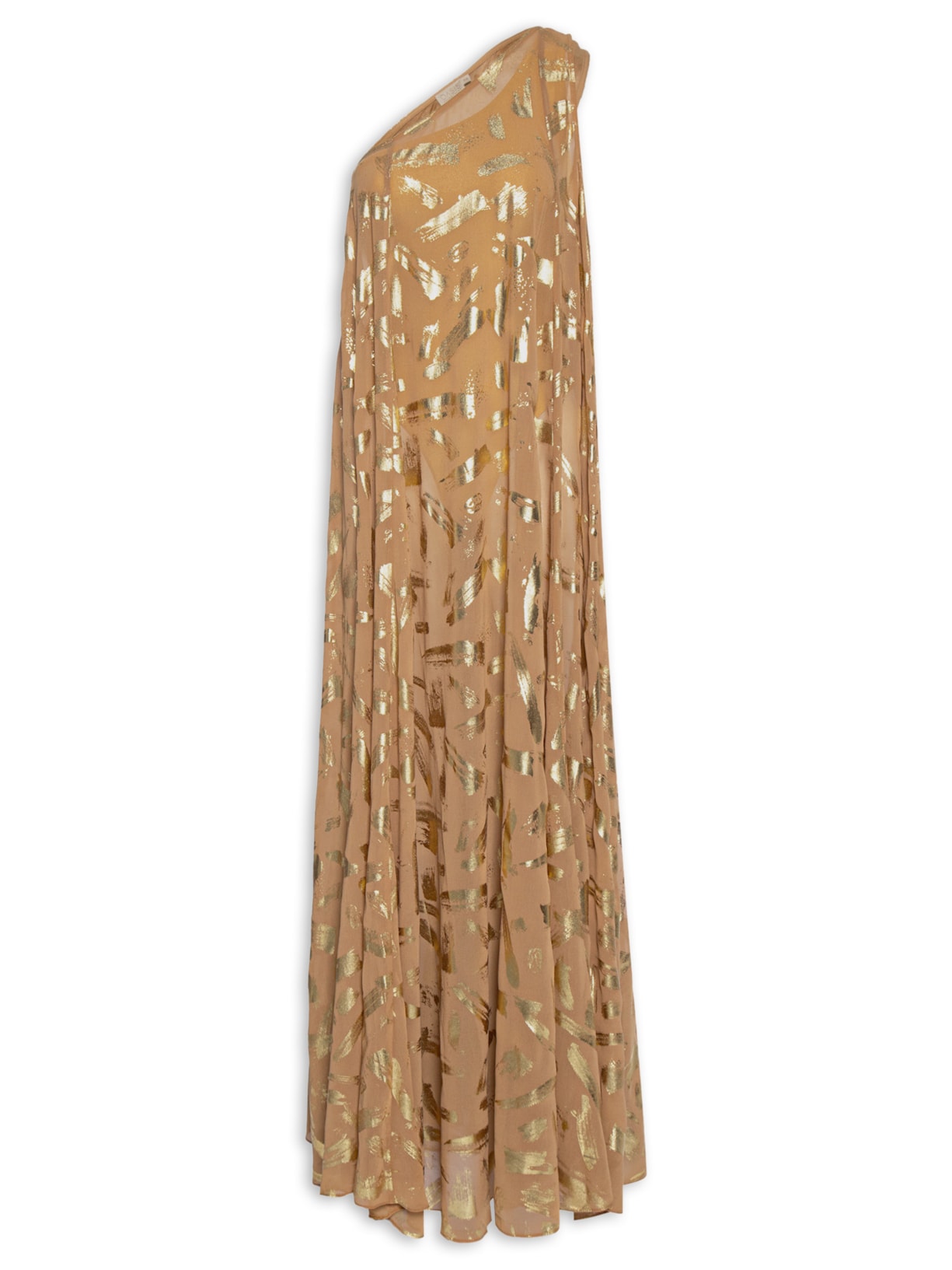O conjunto marrom contém um vestido confeccionado em tecido leve sem elasticidade e um maiô confeccionado em malha cirrê de média elasticidade. O vestido solto ao corpo de modelo ombro único possui decote assimétrico, alça larga, recortes frontais e posteriores, estampa abstrata em tom metalizado, transparência, forro curto solto e comprimento longo. O forro solto ao corpo de modelo ombro único possui decote assimétrico, alça média e comprimento curto. O maiô de modelo ombro único possui decote assimétrico, cava estendida, tecido duplo, sem bojo e acabamento elástico.