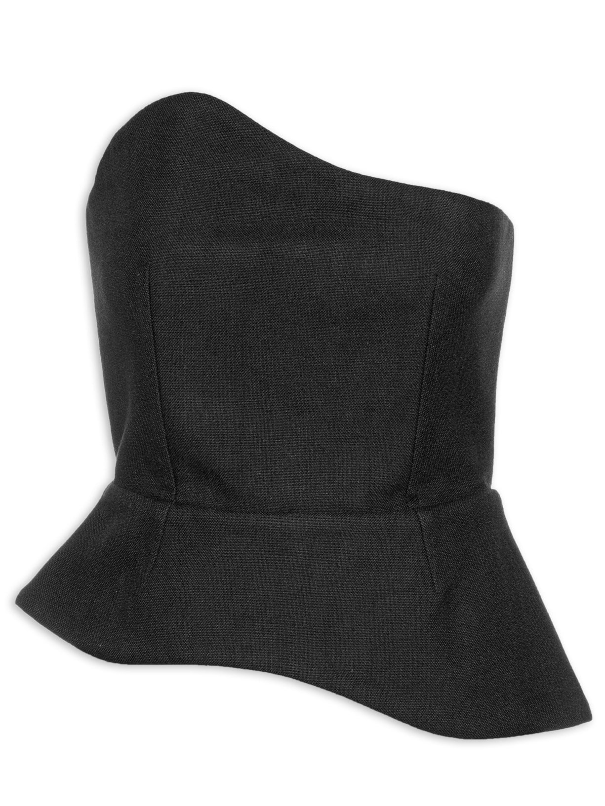 O corset preto é confeccionado em tecido encorpado sem elasticidade. A peça justa ao corpo possui decote assimétrico, sem bojo, recorte na altura da cintura com detalhe de assimetria e fechamento posterior por zíper.