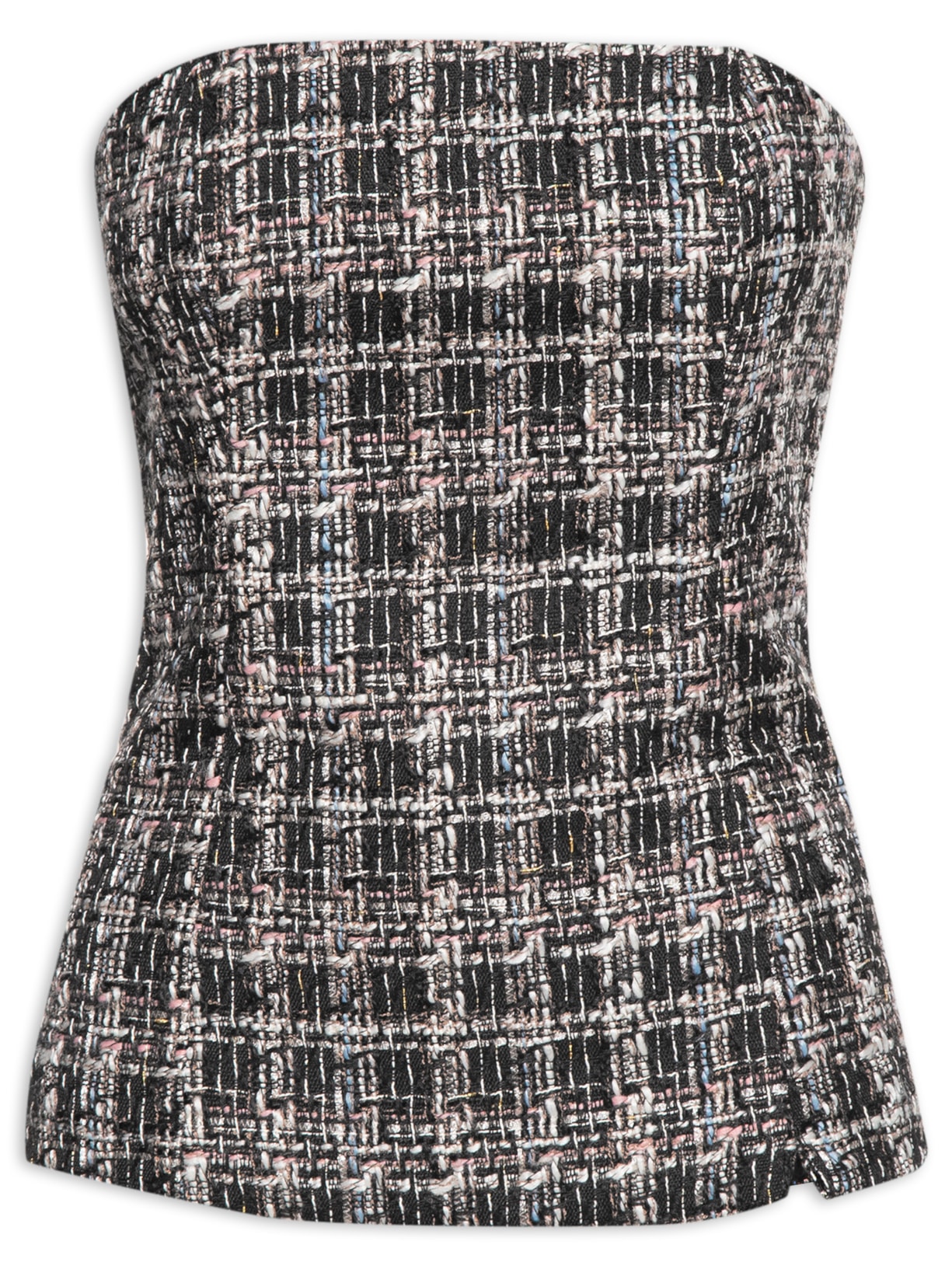 O corset preto é confeccionado em tweed sem elasticidade. A peça justa ao corpo de modelo tomara que caia possui decote reto, parte frontal e posterior com barbatanas embutidas para sustentação, forro sem bojo e fechamento posterior por zíper metalizado.