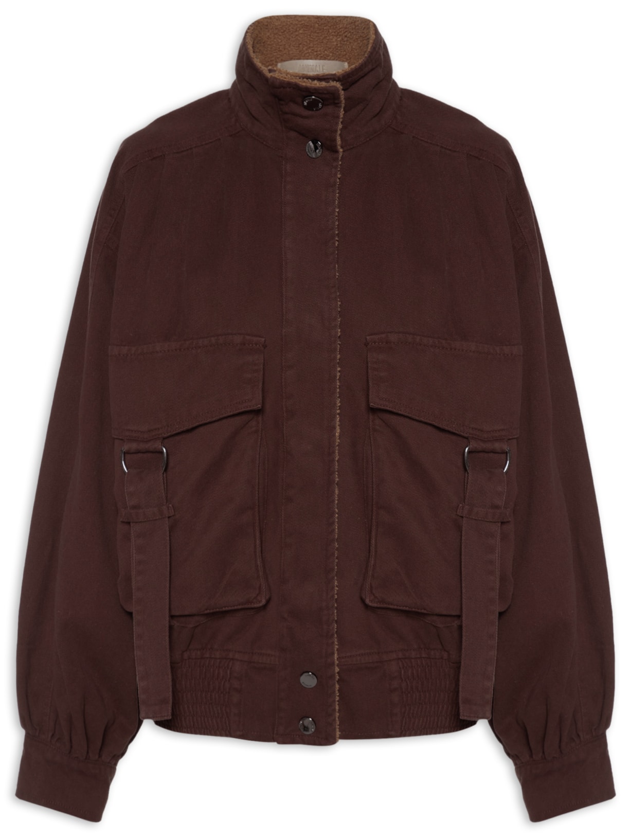 A jaqueta marrom é confeccionada em sarja sem elasticidade. A peça solta ao corpo de modelo oversized* possui gola alta, ombros estendidos com pregas frontais e posteriores, mangas longas com detalhes de franzidos e abotoamento por botões de pressão nos punhos, maxi bolsos frontais de modelo fole com fechamento por abas sobrepostas e faixas ajustáveis com argola e passantes, barra com elástico embutido, forro em plush e fechamento frontal por botões de pressão com vista sobreposta.