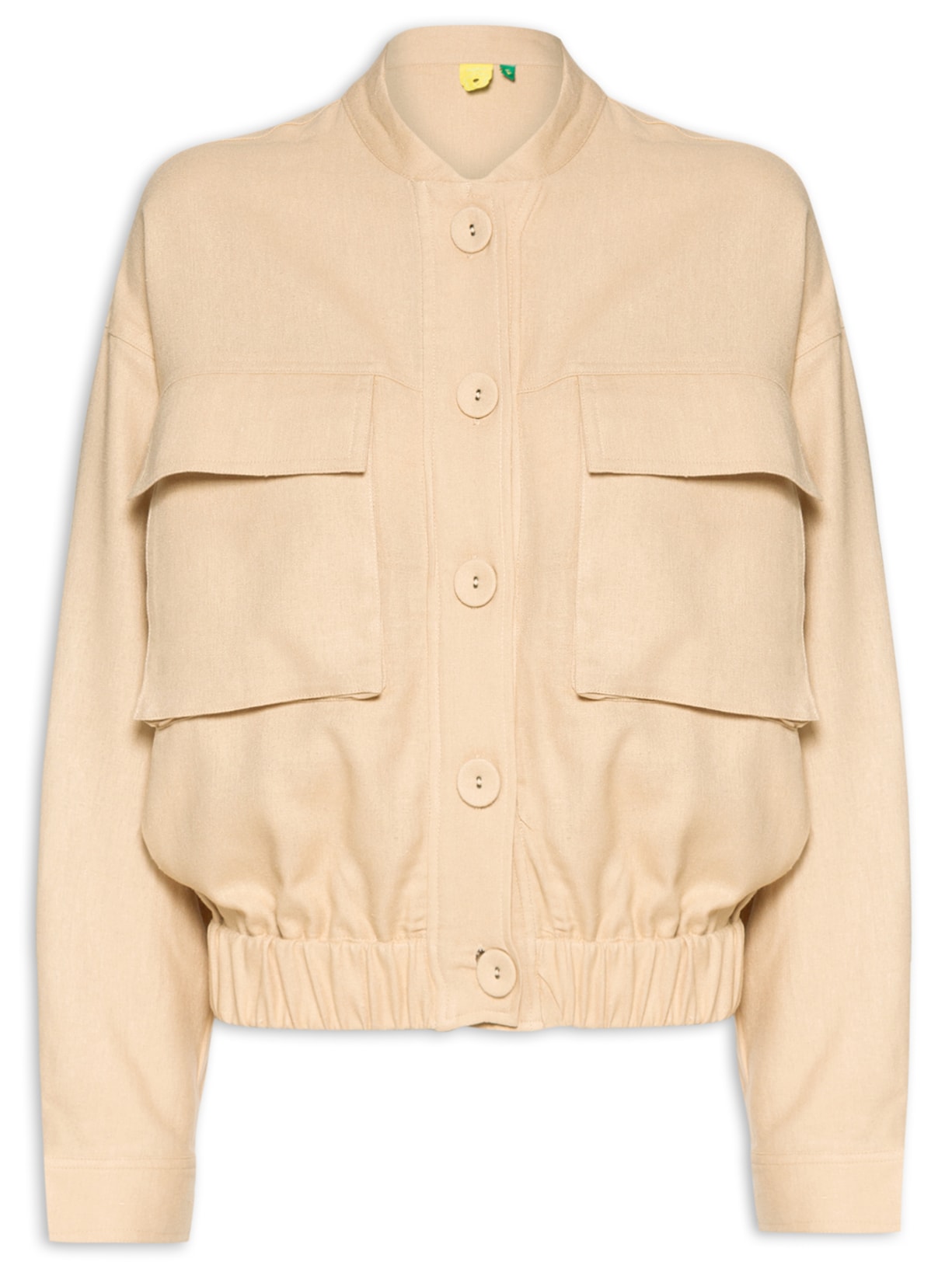 A jaqueta bege é confeccionada em tecido leve com toque de linho sem elasticidade. A peça solta ao corpo de modelo bomber possui colarinho mandarim, ombros estendidos, mangas longas com detalhe de pregas e abotoamento nos punhos, bolsos frontais de modelo fole aplicados na altura do busto com fechamento por abas sobrepostas, recortes posteriores, elástico embutido na barra e fechamento frontal por botões forrados.