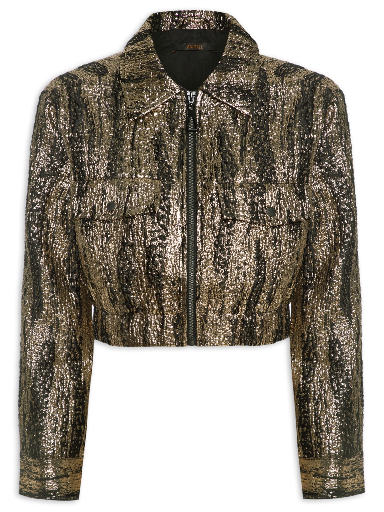 A jaqueta dourada é confeccionada em tecido leve brocado sem baixa elasticidade. A peça solta ao corpo possui colarinho simples, mangas longas com abotoamento de pressão nos punhos, recorte posterior, bolsos frontais com fechamento por aba e botão de pressão, barra com elástico embutido, forro, comprimento cropped* e fechamento frontal por zíper.