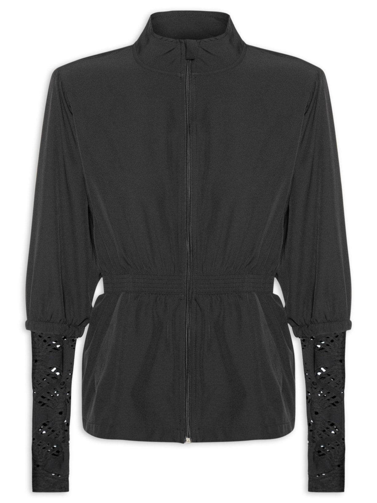 A jaqueta preta é confeccionada em tactel sem elasticidade. A peça solta ao corpo possui gola alta, mangas longas com recorte em malha texturizada e encaixe para a mão, elástico embutido nas mangas e na cintura, bolsos frontais, logo da marca em cor contrastante na parte posterior e fechamento frontal por zíper.