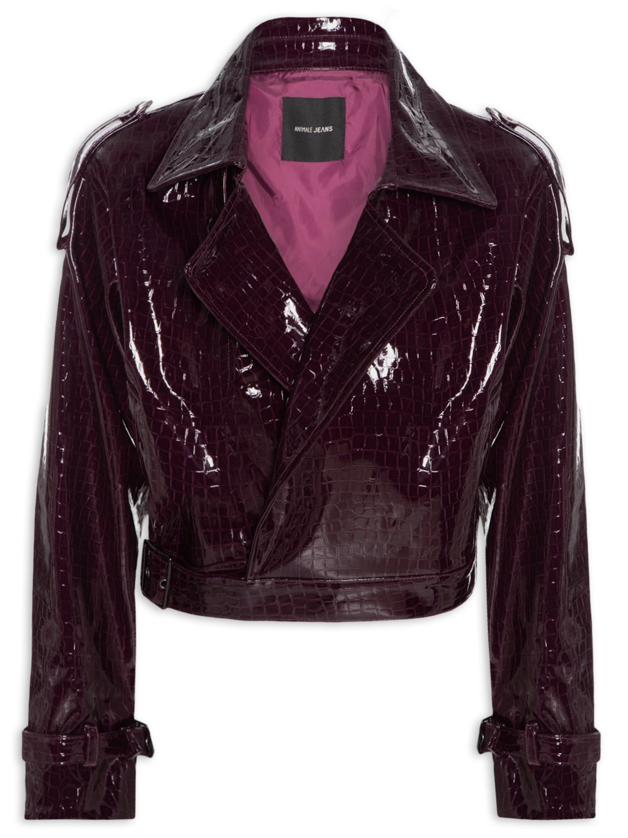 A jaqueta vinho é confeccionada em material sintético com superfície croco, envernizada e sem elasticidade. A peça solta ao corpo possui lapela chanfrada, martingale aplicado nos ombros, mangas longas com detalhe de tira média com ilhóses metálicos e fivela para ajuste, recortes frontais sobrepostos em camada, bolsos frontais embutidos, recorte posterior vazado, barra com tira estendida e fivela metálica para ajuste, forro e sem fechamento.