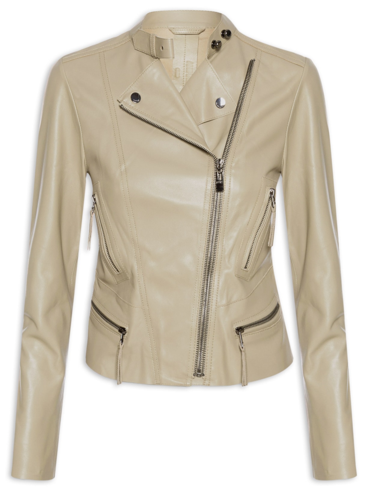 A jaqueta bege é confeccionada em couro. A peça solta ao corpo possui lapela chanfrada com tachas metálicas, mangas longas com zíper nos punhos, recortes posteriores e frontais, bolsos frontais decorativos com fechamento por zíper com puxador e fechamento frontal por zíper.