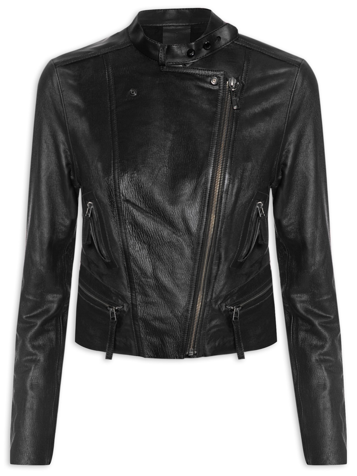 A jaqueta preta é confeccionada em couro sem elasticidade. A peça justa ao corpo possui colarinho com aboatoamento por encaixe, mangas longas com fechamento por zíper, lapela com botões de pressão, bolsos frontais decorativos com fechamento em zíper, recorte porsterior, acabamento pespontado, fechamento em zíper e comprimento médio.