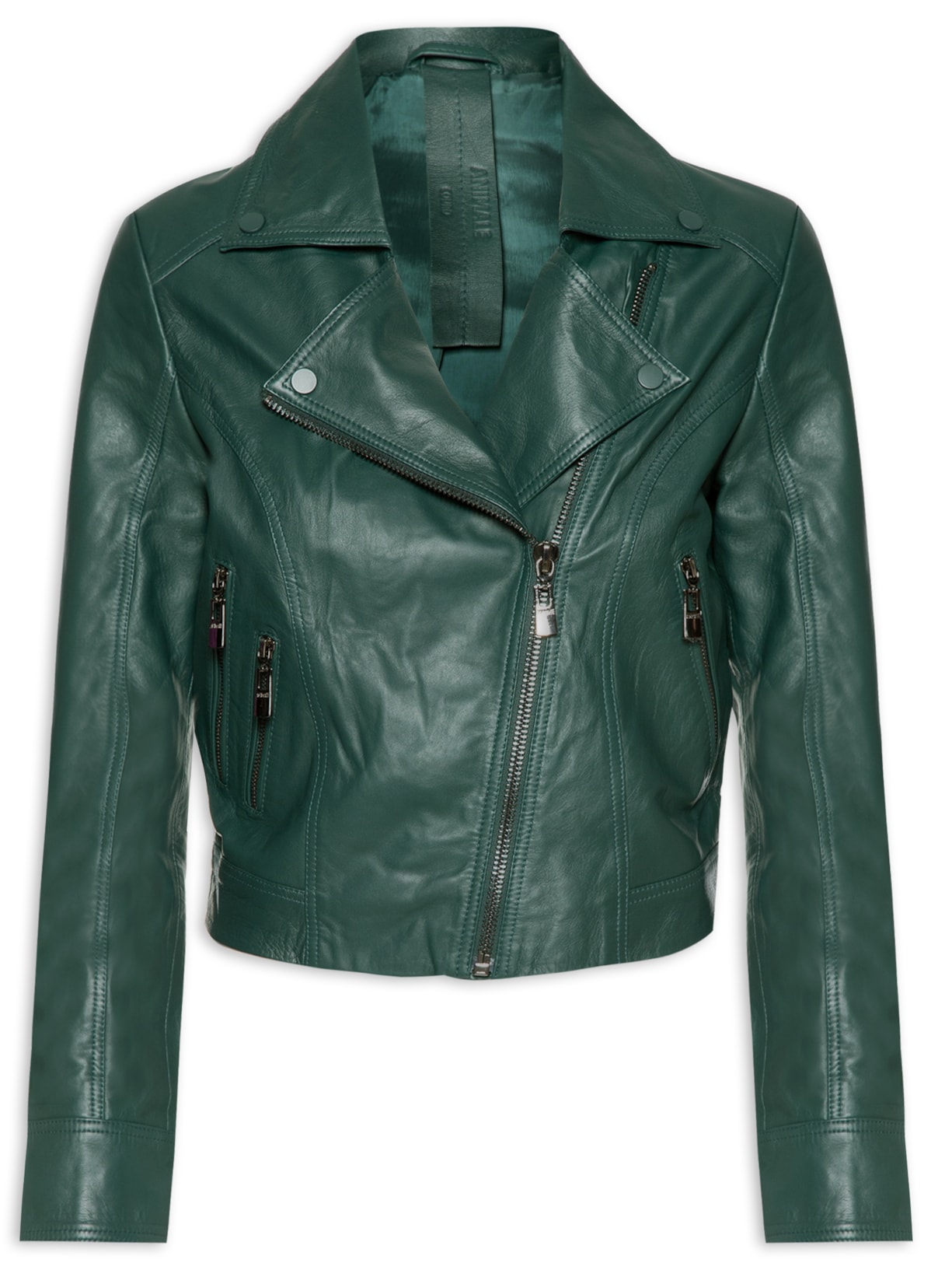 A jaqueta verde é confeccionada em couro sem elasticidade. A peça solta ao corpo possui lapela chanfrada, mangas longas com abotoamento nos punhos, bolsos frontais de fechamento em zíper, recortes frontais e posteriores, tiras sobrepostas na parte posterior com detalhe de abotoamento, forro e fechamento frontal em zíper.