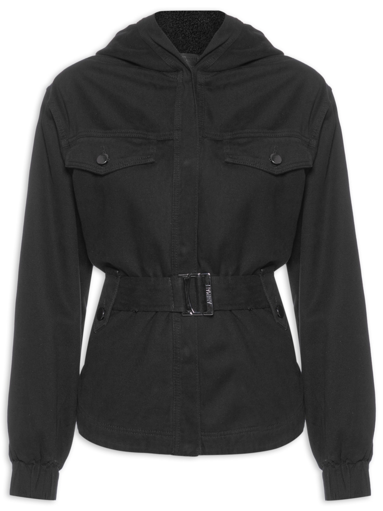 A jaqueta preta é confeccionada em sarja sem elasticidade. A peça solta ao corpo possui capuz, mangas longas com ajuste nos punhos, bolsos frontais com aba sobreposta na altura do busto e com fechamento por botão, recortes posteriores e frontais, ombros estendidos, passantes laterais com fechamento por botão com faixa de mesma cor com fivela para regulagem e uso opcional, parte interna em pelúcia e fechamento frontal por botões.