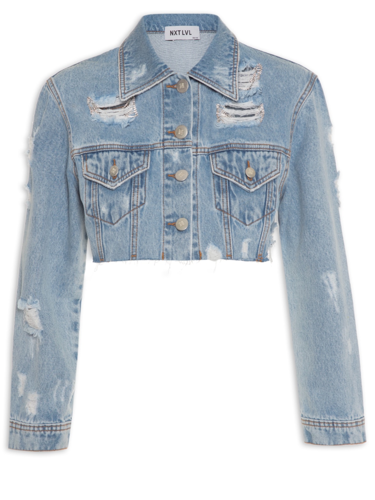 A jaqueta azul é confeccionada em sarja com lavagem jeans. A peça possui colarinho clássico, mangas longas com abotoamento nos punhos, recortes nas partes frontal e posterior, detalhes destroyed*, aplicação de franjas em strass na parte frontal, bolsos frontais com fechamento por aba e botão, barra com corte a fio, comprimento cropped**, shape solto, caimento reto, acabamento pespontado e fechamento frontal por botões.