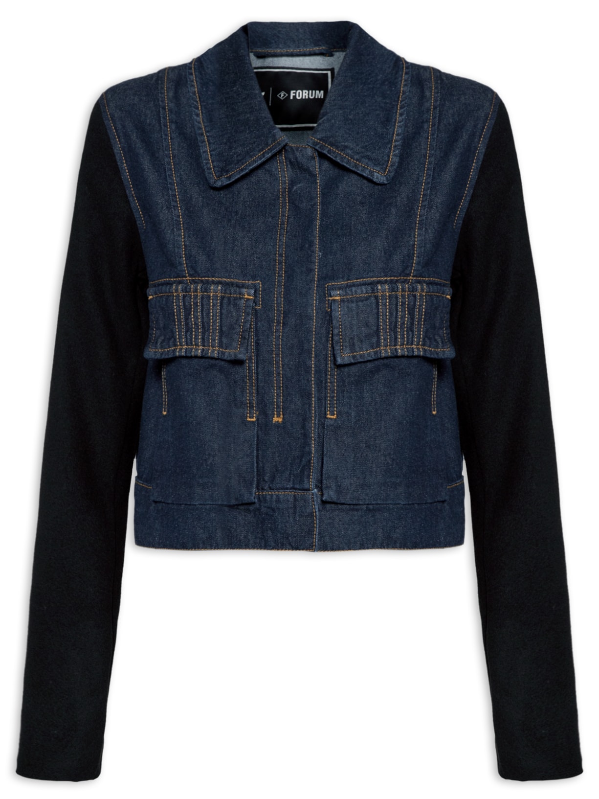 A jaqueta azul marinho é confeccionada em sarja com lavagem em jeans. A peça possui colarinho simples, mangas longas tecido encorpado preto com forro em tactel, recortes posteriores e frontais, tag da marca bordada na parte posterior, bolsos frontais com fechamento por botão com vista sobreposta, pesponto em cor contrastante, detalhe de martingales na parte posterior, na altura da barra, comprimento cropped* e fechamento frontal por botões com vista sobreposta.