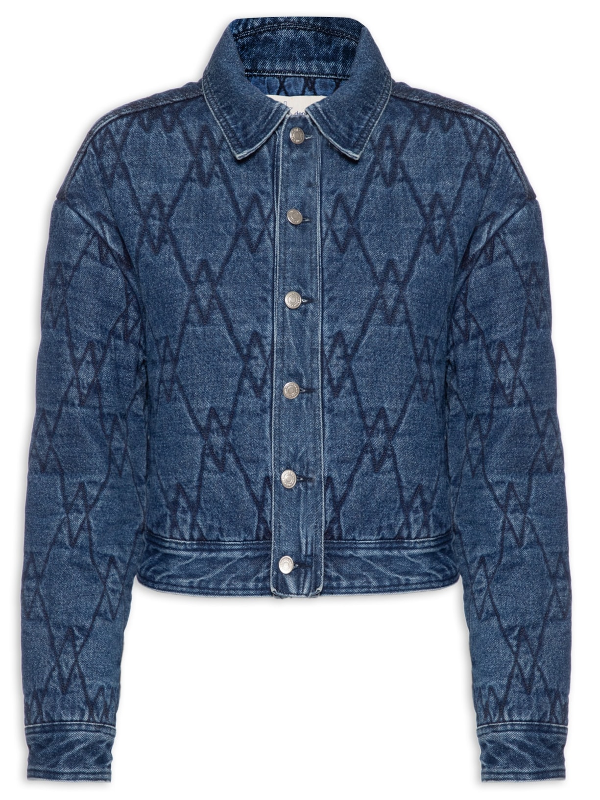 A jaqueta azul é confeccionada em sarja com lavagem em jeans e baixa elasticidade. A peça solta ao corpo possui colarinho clássico, mangas longas com abotoamento nos punhos, superfície em matelassê, ombros estendidos, forro, comprimento cropped* e fechamento frontal por botões.