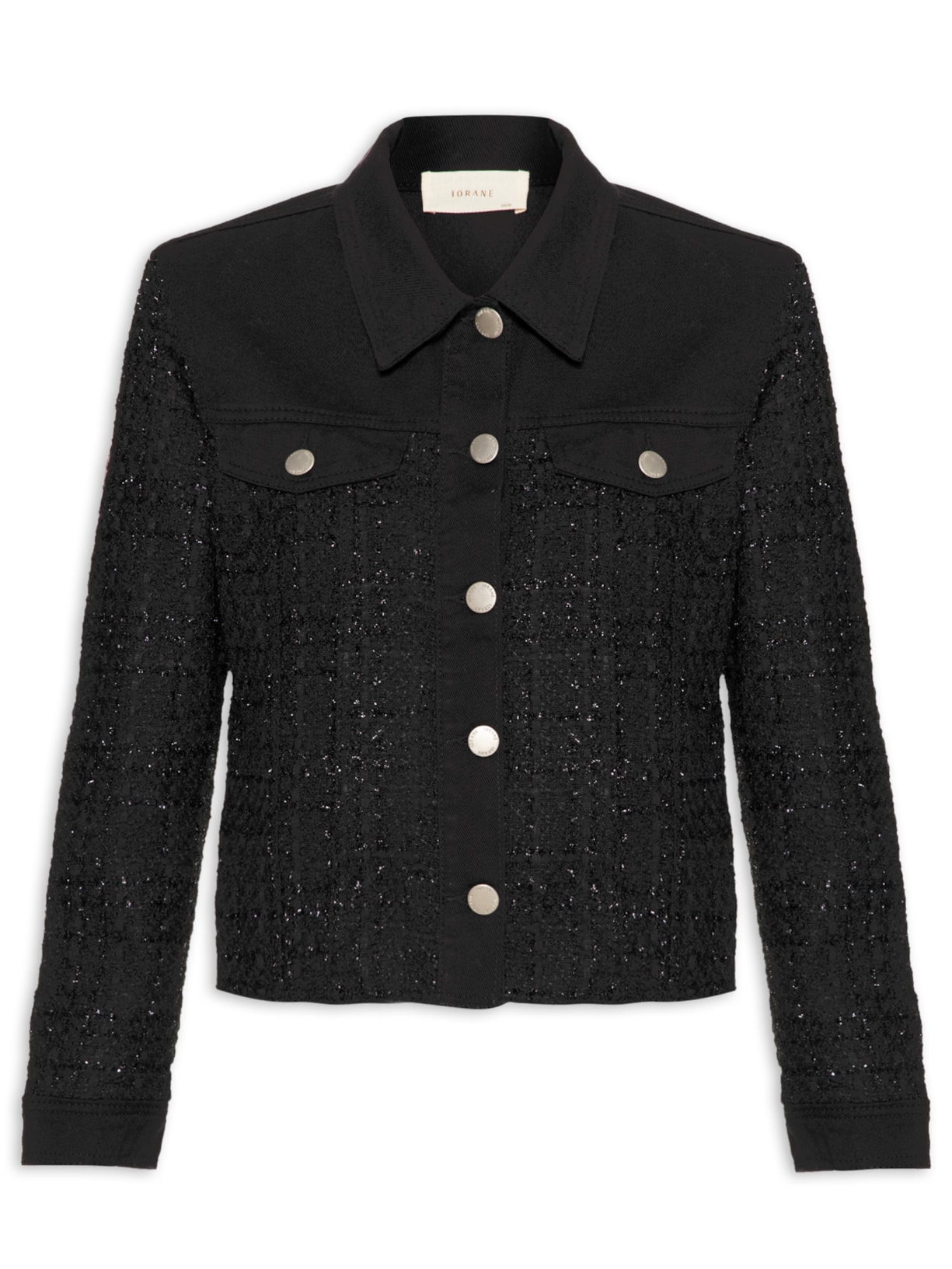 A jaqueta preta é confeccionada em tweed. A peça possui colarinho simples, mangas longas com detalhe de pregas e abotoamento nos punhos, recorte frontal e posterior em sarja com bolsos e botões decorativos aplicados, recortes frontais, forro, comprimento cropped*, shape solto e fechamento frontal por botões.