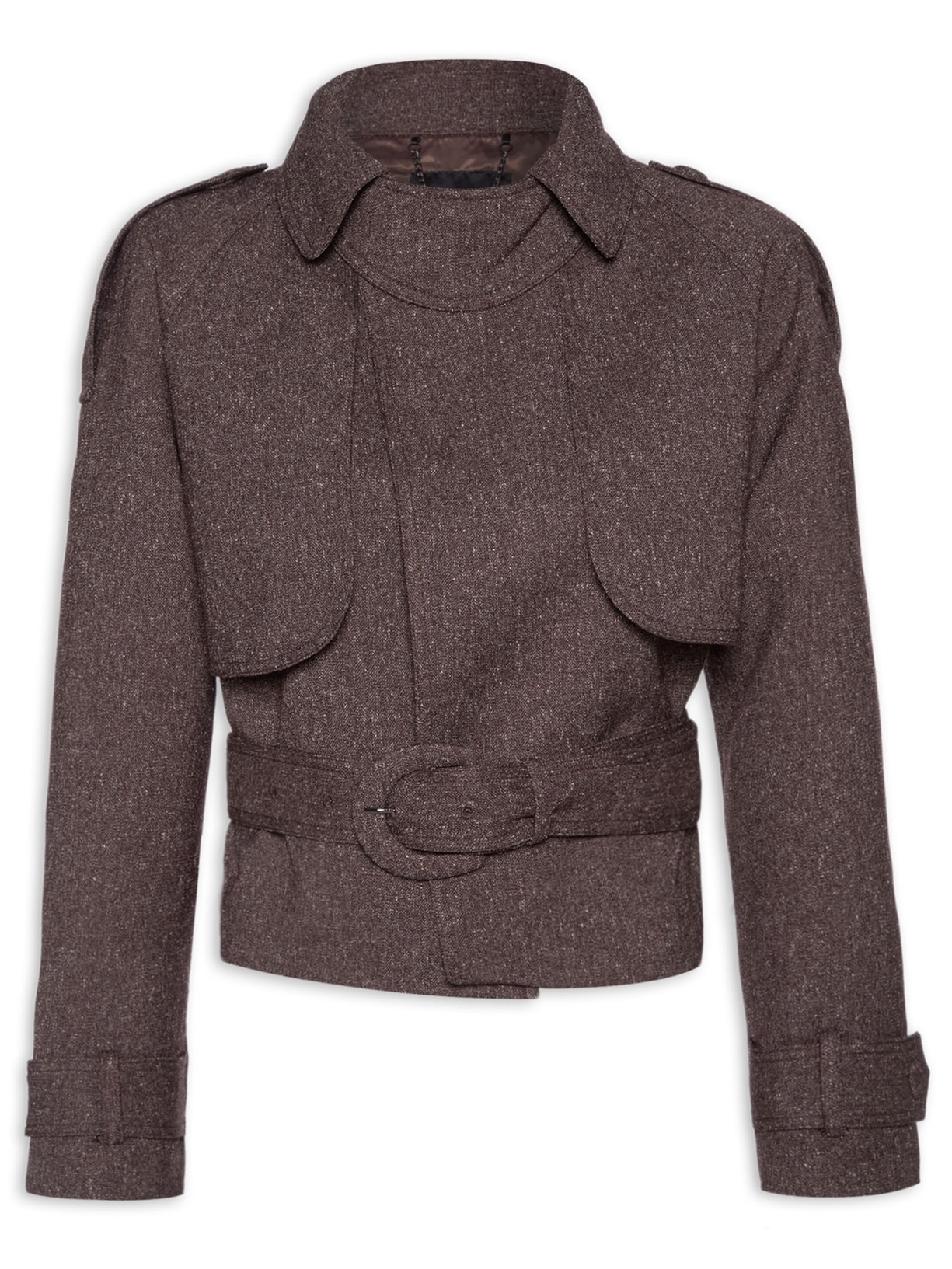 A jaqueta marrom é confeccionada em malha encorpada sem elasticidade. A peça solta ao corpo possui colarinho clássico com tira aplicada com fechamento por botão, mangas longas com martingales aplicados, tecido sobreposto aplicado na parte frontal, martingales aplicados nos ombros, passantes posteriores e forro. A companha cinto do mesmo tecido e espessura média para uso opcional.