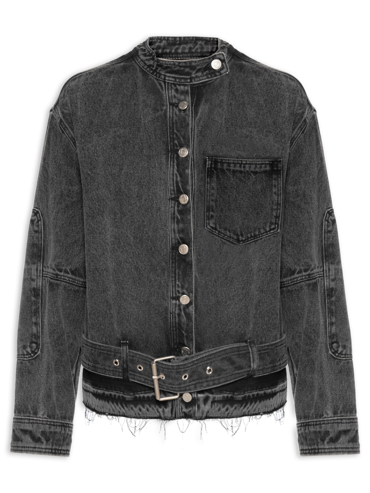 A jaqueta preta é confeccionada em sarja sem elasticidade. A peça solta ao corpo de modelo parka possui gola levemente alta, bolso aplicado na altura do busto, mangas longas com abotoamento nos punhos e detalhe de recortes, recortes posterior, barra com efeito estonado e desfiado com passantes aplicados, e fechamento frontal por botões. Acompanha cinto da mesma cor e tecido com detalhe de ilhoses e fivela em metal.