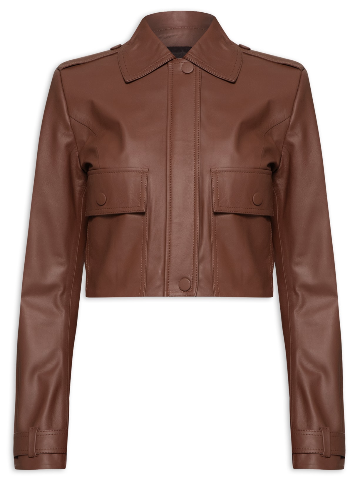 A jaqueta marrom é confeccionada em couro sem elasticidade. A peça solta ao corpo possui gola clássica, ombros com detalhe de tira sobreposta e abotoamento, mangas longas com fenda de fechamento em zíper e tira sobreposta com abotoamento, recortes, bolsos frontais com fechamento em botão de pressão, tiras aplicadas na parte posterior, forro, comprimento cropped* e fechamento frontal em zíper e botões de pressão com viés sobreposto.