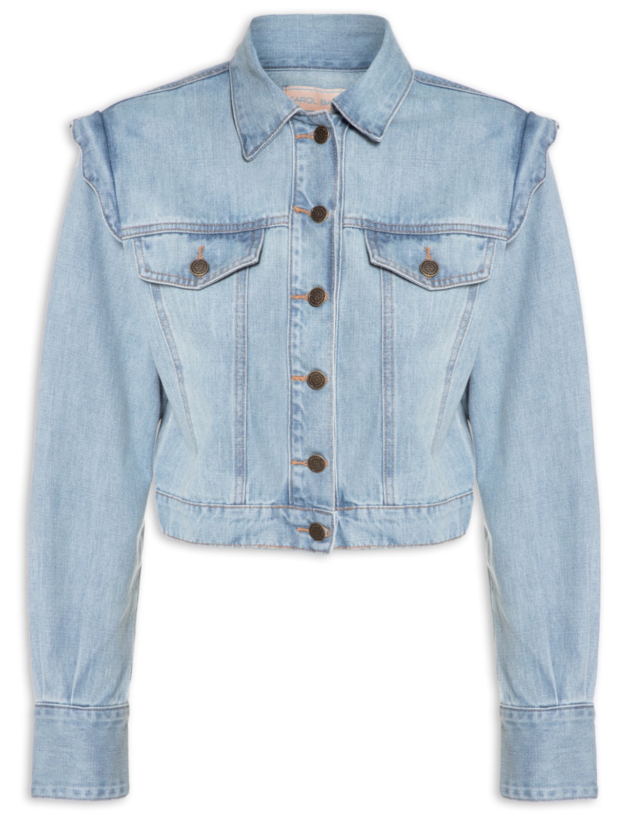 A jaqueta azul é confeccionada em sarja com lavagem jeans. A peça possui colarinho simples, babados aplicados nas cavas, mangas longas com detalhe de pregas e abotoamento nos punhos, recortes frontais e posteriores, bolsos frontais com fechamento por abas sobrepostas e botões aplicados na altura do busto, comprimento cropped*, shape solto, caimento reto, acabamento pespontado e fechamento frontal por botões.