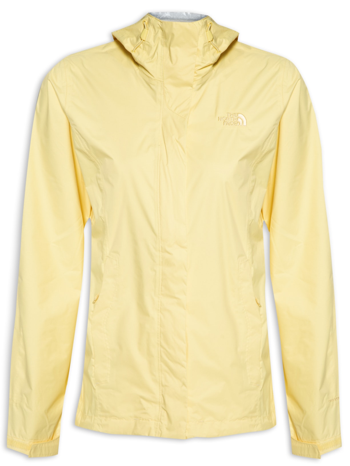 A jaqueta amarela é confeccionada em tactel. A peça possui capuz com cordão embutido para ajuste, mangas longas com ajuste nos punhos, recortes frontais e posteriores, nome e logo da marca bordados nas partes posterior e frontal na altura do busto, bolsos frontais embutidos com fechamento por zíper e aba, shape solto, caimento reto, acabamento pespontado e fechamento frontal por velcro e zíper com pala sobreposta.