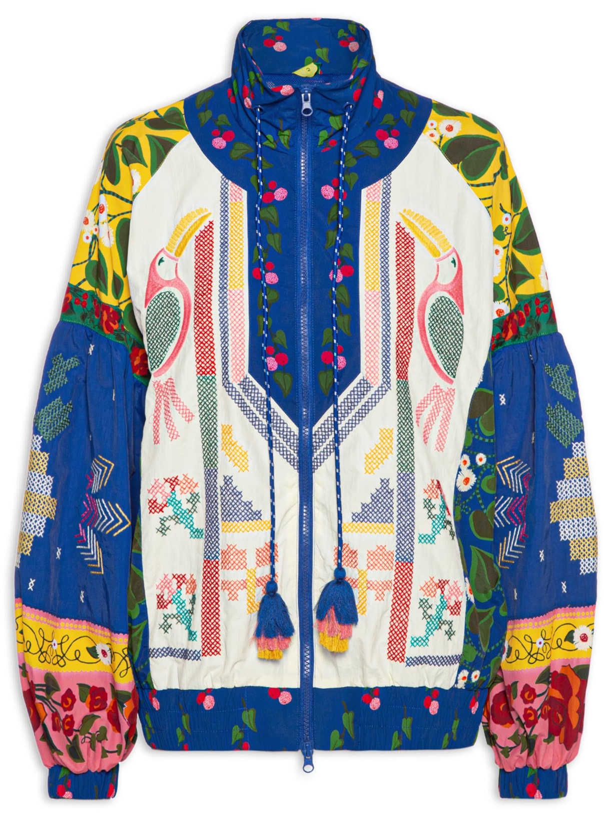 A jaqueta azul é confeccionada por nylon sem elasticidade. A peça solta ao corpo de modelo windbreaker possui gola alta com cordão embutido para ajuste, mangas longas com elástico embutido nos punhos, recortes frontais e posteriores, mix de estampas em cores contrastantes, bordados ponto cruz em cores contrastantes, elástico embutido na barra, forro em mesh, bolso frontais no modelo faca e fechamento por zíper frontal.