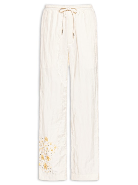 O resultado? A ideia de sobreposições define um conjunto de calça e jaqueta bomber, que transitam entre o feminino e masculino, com bordados botânicos coreanos em paetês transparentes.