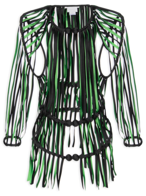 Em busca de novos encaixes para as manualidades tão significativas em seu trabalho, ao tecnológico, o casaco é produzido a partir de dois tecidos que são dublados e recortados a laser, posicionados através de tramas manuais, um trabalho minucioso e especial, combinado à uma estrutura de esqueleto produzido em corda, e envolvido com tecido de seda. Os aviamentos metálicos e os tons de verde cravam os detalhes sofisticados do design de Andrey.